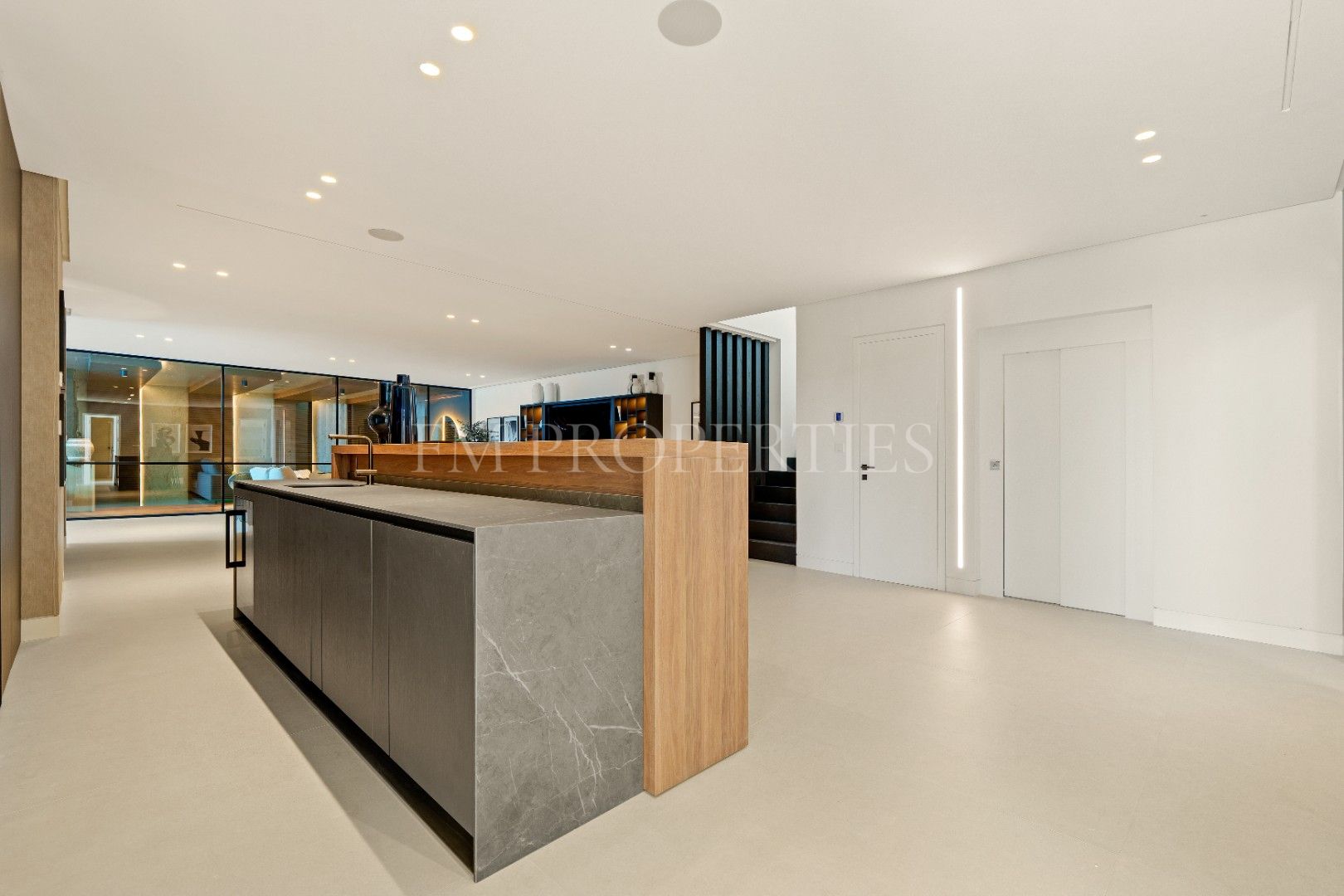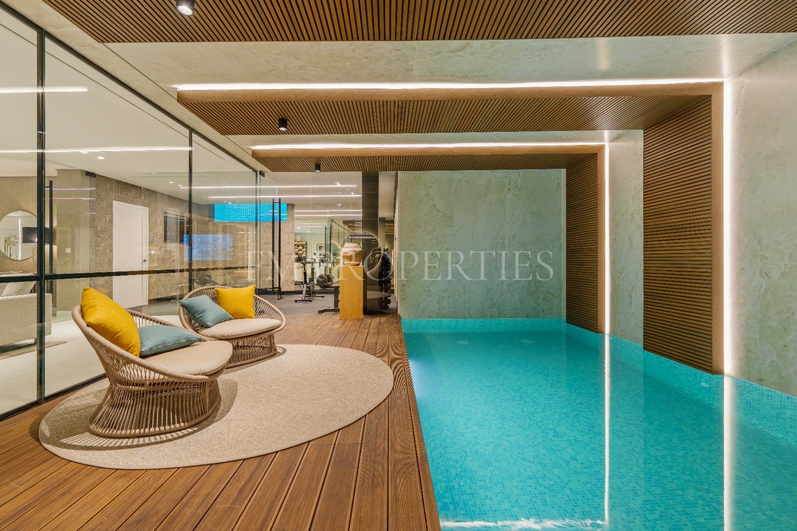 Eine ganze Etage ist dem Wohlbefinden gewidmet, mit einem voll ausgestatteten Fitnessraum, privatem Spa und beeindruckendem Hallenbad mit modernen Oberflächen. Ein separater Entertainment-Bereich mit Heimkino und Spielzimmer bietet zusätzlichen Raum für Unterhaltung und Erholung.
