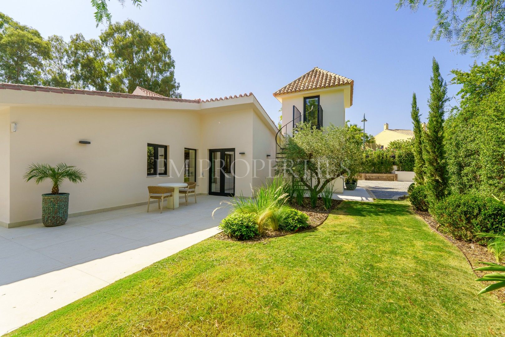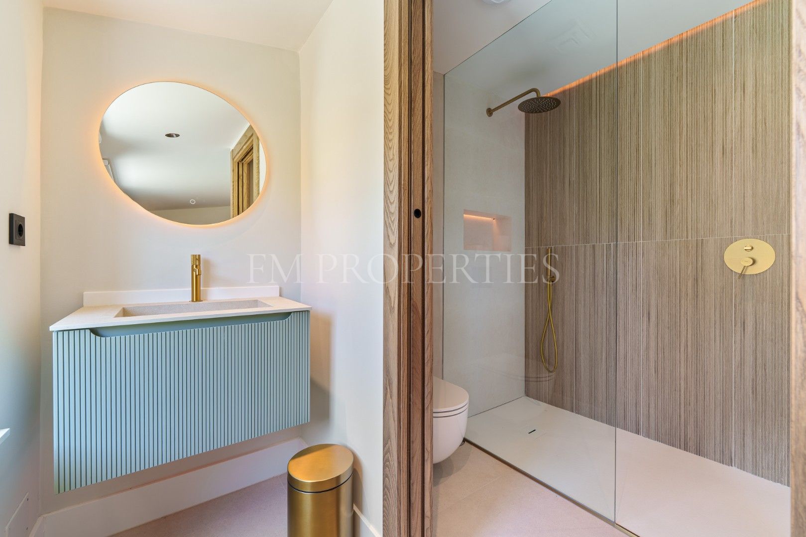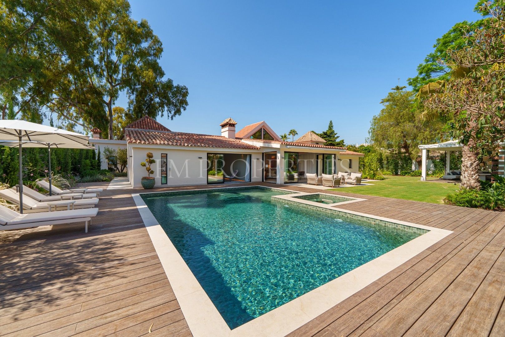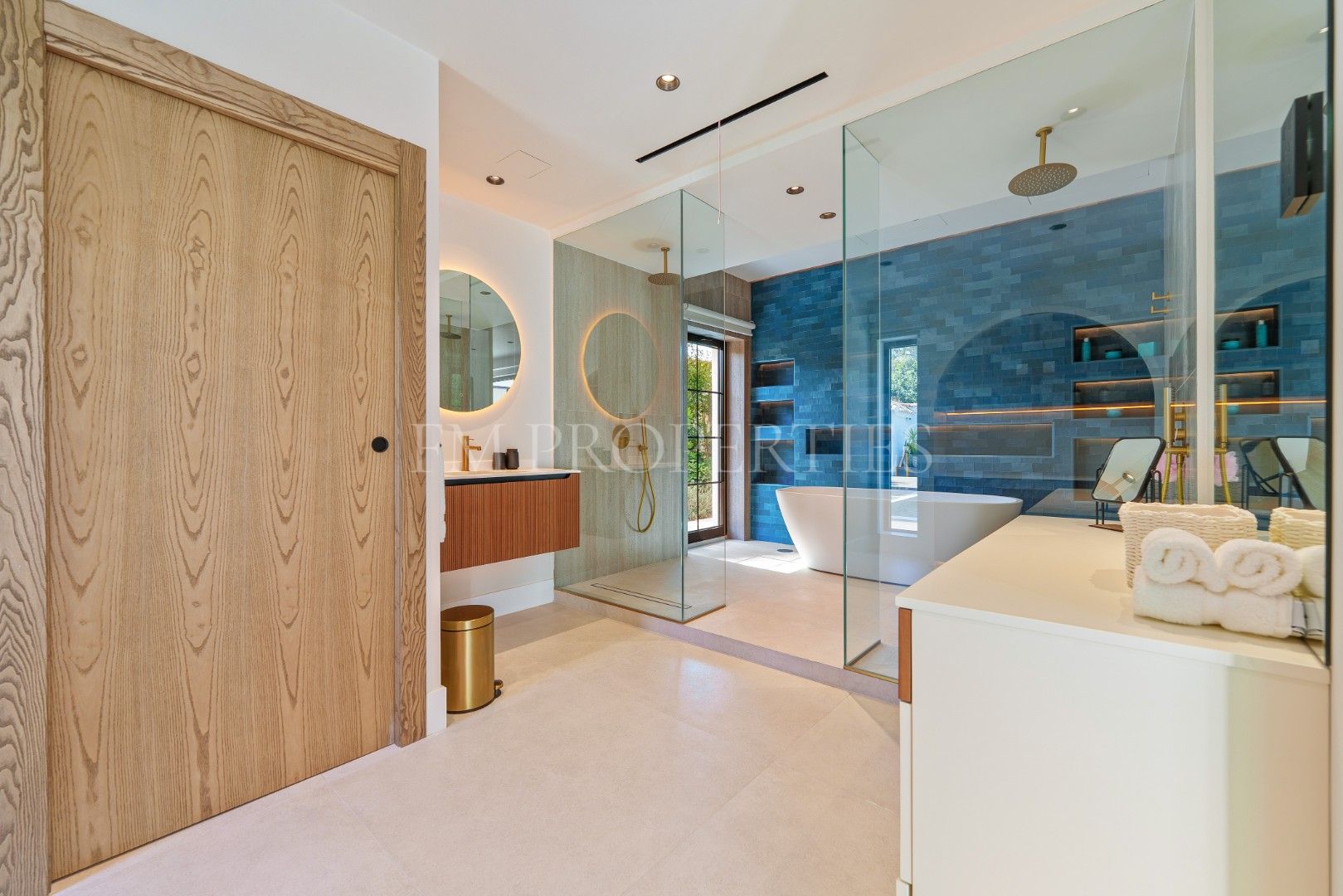 Der sorgfältig gestaltete Garten ist sowohl für Entspannung als auch für Unterhaltung konzipiert. Im Zentrum befindet sich ein großer privater Pool, umgeben von einer eleganten Holzterrasse und ausgestattet mit Sonnenliegen und Sonnenschirmen. Mehrere Chill-out-Bereiche, eine überdachte Außenküche mit integriertem Grill sowie eine stilvolle Lounge unter einer Pergola bieten ein nahtloses Outdoor-Leben und nutzen die Sonne Marbellas das ganze Jahr über optimal.