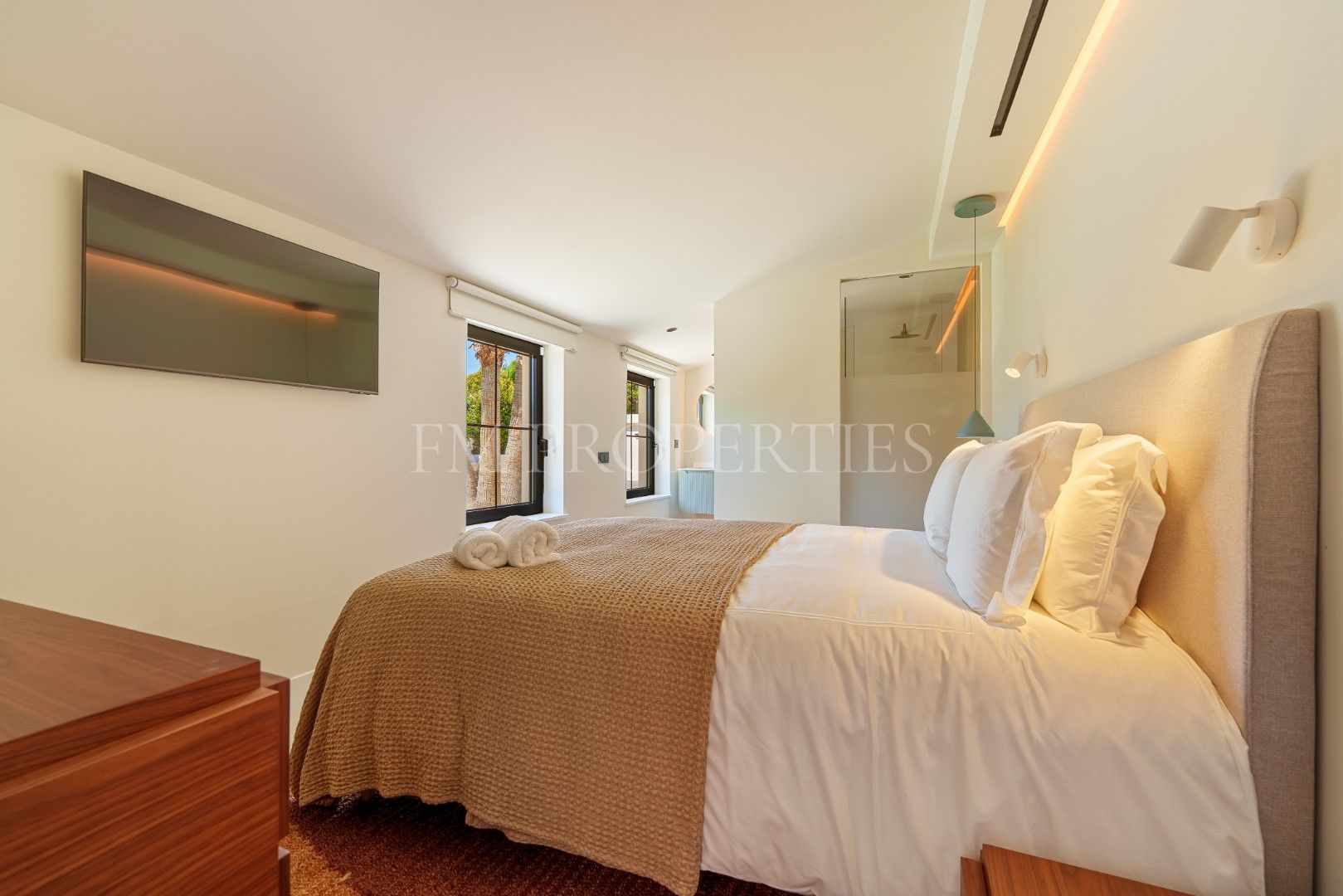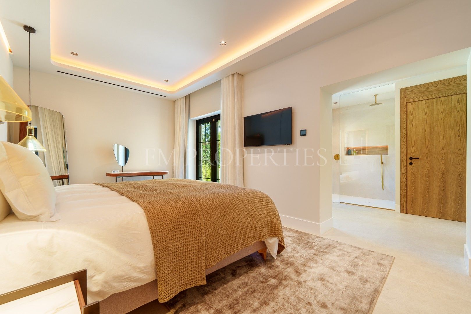 Im Inneren kombiniert die Villa sanften Minimalismus mit warmen Naturtönen und verfügt über eine voll ausgestattete Küche mit Kochinsel, ein großzügiges Esszimmer und ein gemütliches Wohnzimmer mit Kamin und maßgefertigten Möbeln. Die Master-Suite öffnet sich direkt zur Poolterrasse und umfasst ein luxuriöses Badezimmer mit freistehender Badewanne und begehbarer Dusche.