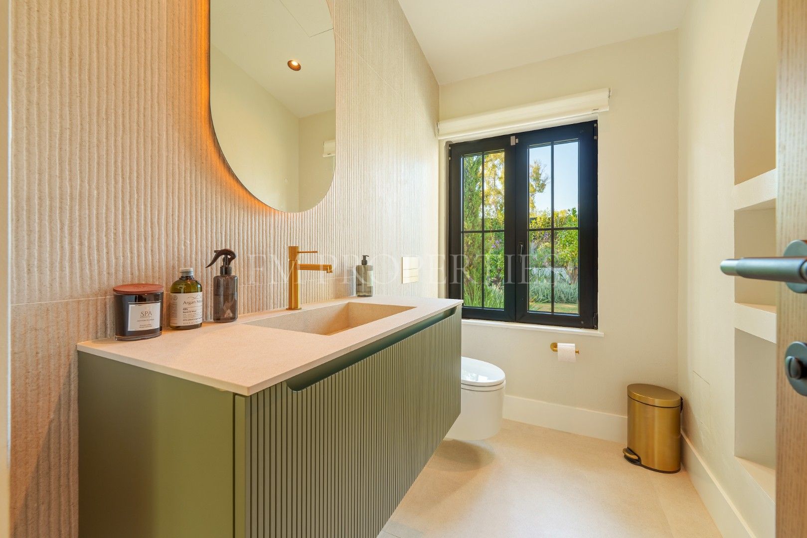 Auf einem großzügigen Grundstück mit absoluter Privatsphäre gelegen, bietet diese Immobilie fünf geräumige Schlafzimmer, offene Wohnbereiche und eine beeindruckende Eingangshalle mit doppelter Deckenhöhe und geometrischem Dachdesign, das einen markanten architektonischen Akzent setzt. Klare Linien, hochwertige Ausstattungen und große Fenster schaffen eine lichtdurchflutete Atmosphäre, die perfekt für den modernen mediterranen Lebensstil ist.