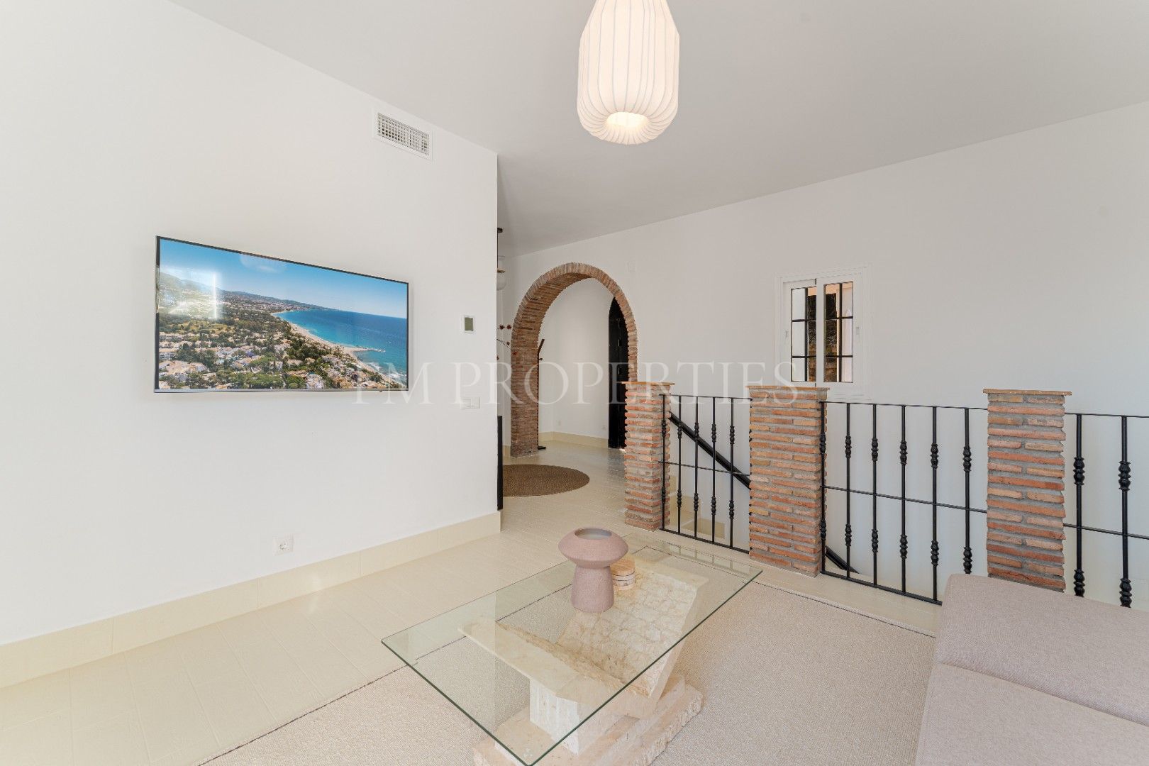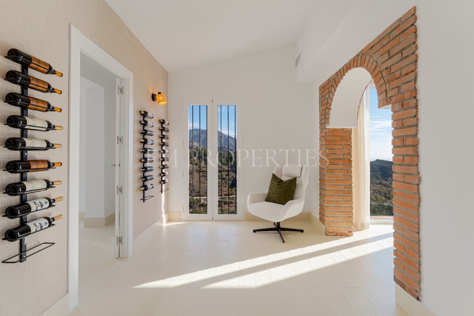 With 531 m² of built space on an elevated 4,795 m² plot, this six-bedroom, five-bathroom villa combines the warmth of Andalusian architecture with carefully updated contemporary details. The entrance hall leads to a cozy sitting area and an ensuite bedroom ideal for offering guests a private retreat. On the lower level, the spaces open onto a bright living room with direct access to the terrace, a modern kitchen equipped with Siemens appliances, and a dining area that frames the valley views. This floor also includes the master suite, an additional bedroom, a laundry room, and a guest toilet, creating a practical and fluid layout for daily living.