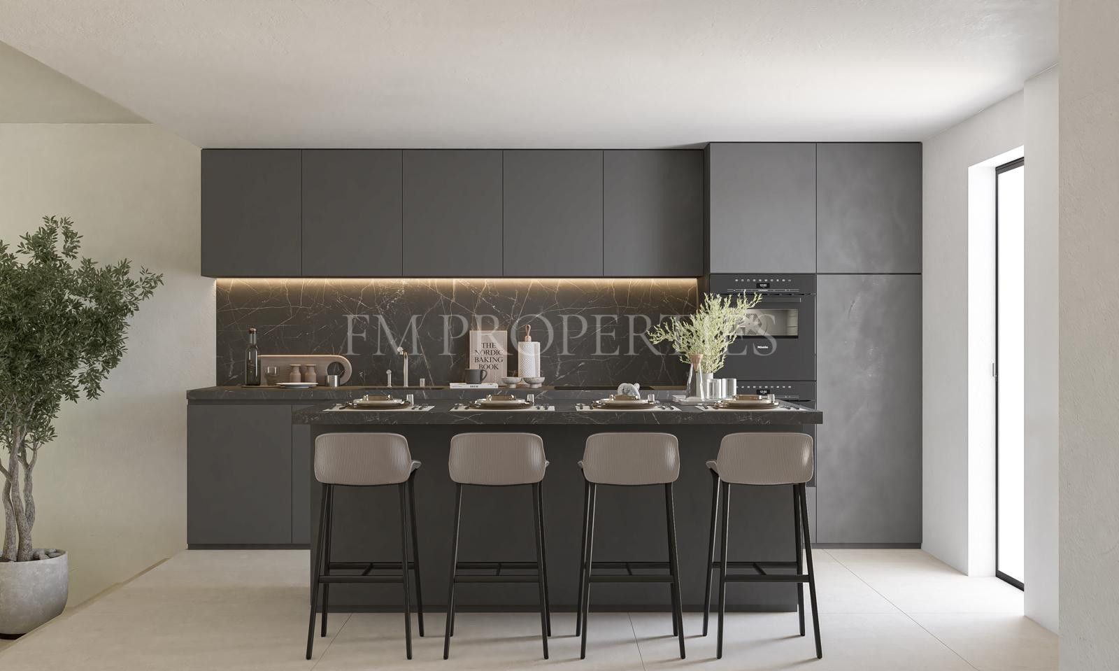 The layout is ideal for modern living. The ground floor features a superb open-plan kitchen with living and dining areas, guest cloakroom, separate laundry room, and a lovely covered terrace leading onto a private garden with golf and sea views. Upstairs offers 3 bedrooms and 2 bathrooms, including a magnificent master suite with terrace overlooking the golf course and the Mediterranean. A staircase leads to the expansive rooftop solarium with barbecue and outdoor kitchen, perfect for sunbathing, entertaining, and al-fresco dining.