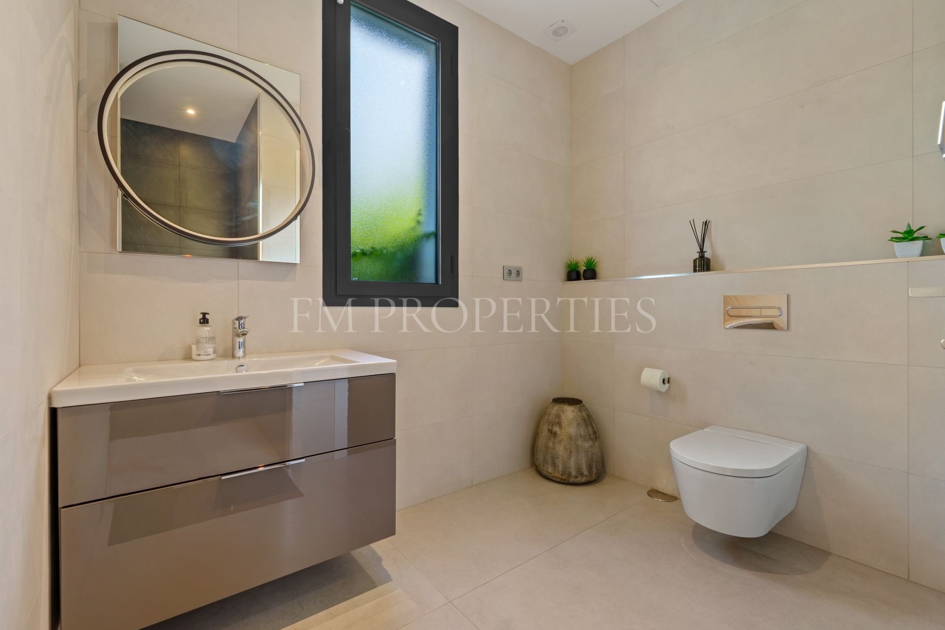 With 581 m² of built space on a 1,231 m² plot, the villa features a spacious and well-designed layout. The main floor includes an open-plan living room, dining area and fully equipped kitchen, all connected through floor-to-ceiling glass doors that open directly onto the terraces and garden. The property offers 6 bedrooms and 5 bathrooms, along with two guest toilets, featuring contemporary interiors, elegant finishes and abundant natural light. Many of the bedrooms include private terraces that enhance privacy and comfort.