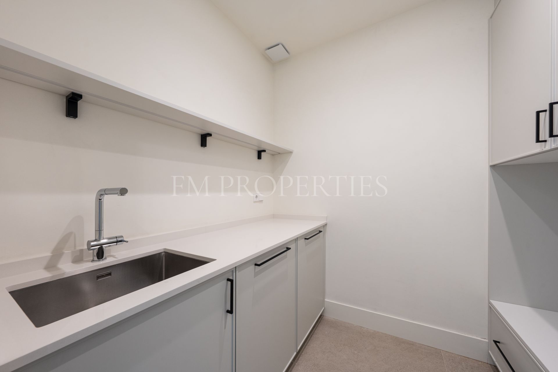 Outstanding features include a rooftop solarium with Jacuzzi and built-in barbecue, perfect for enjoying sunsets, a pre-installed domotic system, integrated ceiling sound system, and vast possibilities in the basement level, which can be customised as a gym, home cinema or spa with direct access to the garden. The modern architecture, defined by clean lines and noble materials, harmonises with the natural surroundings to reinforce the sense of exclusivity.