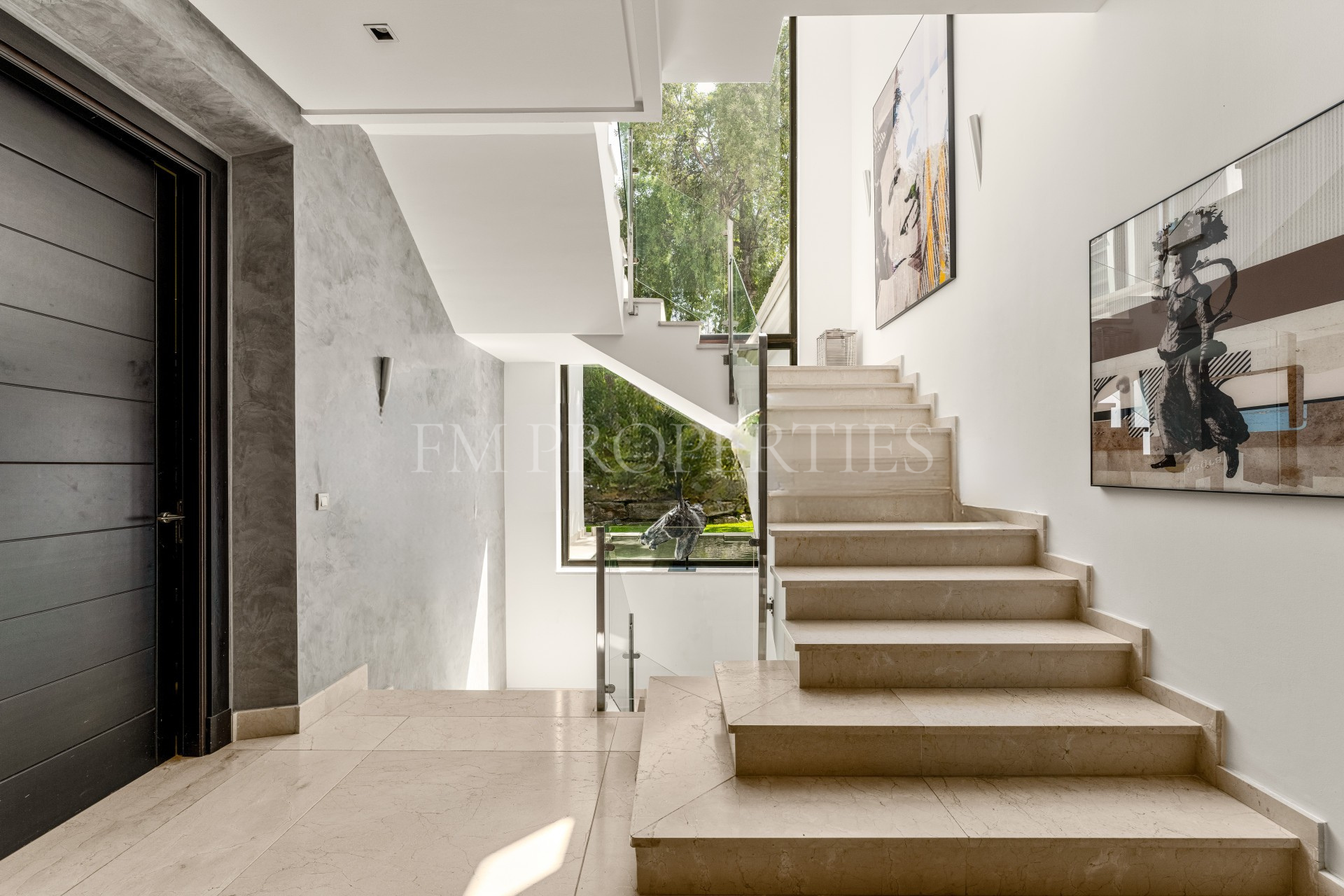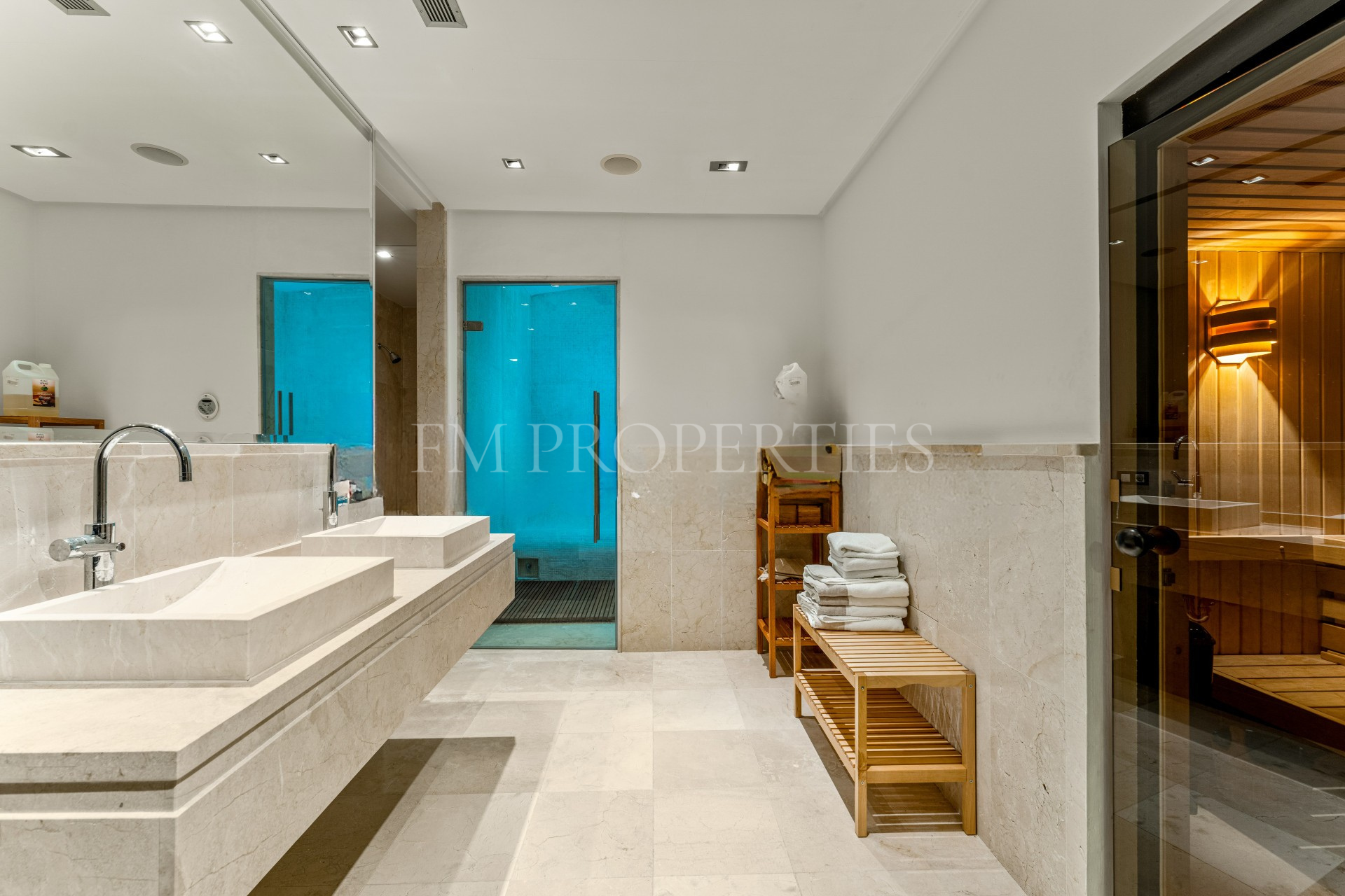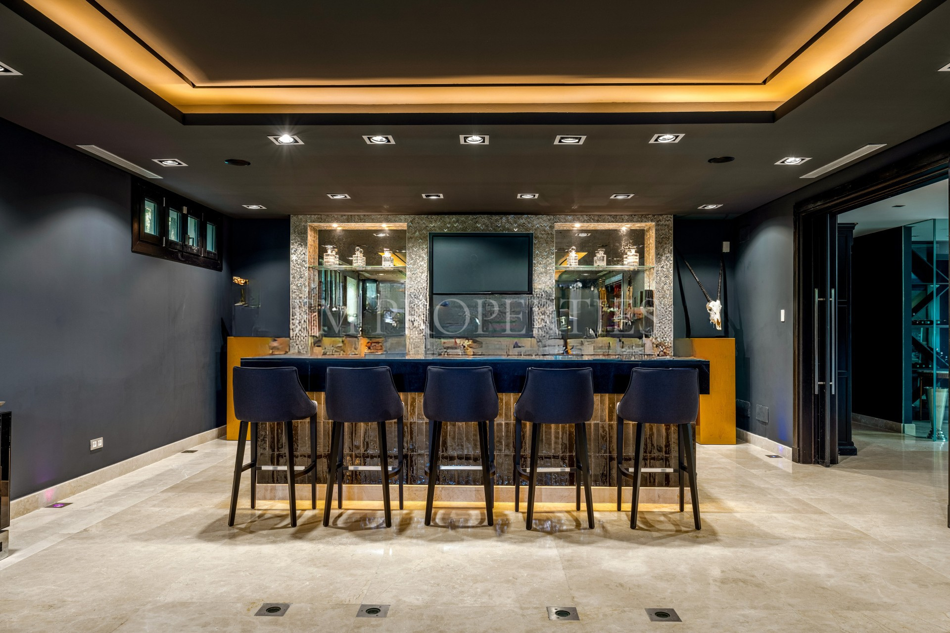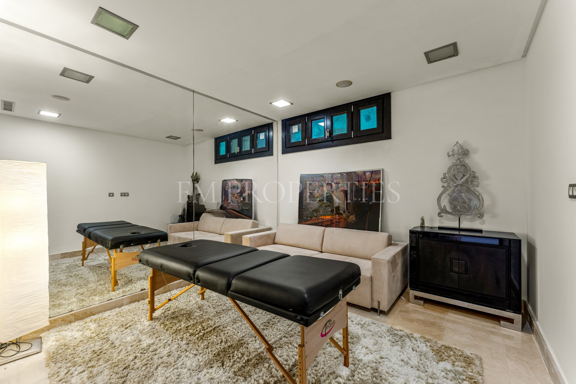 Every detail of this villa has been conceived to offer an unparalleled living experience: wine cellar, private cinema, gym, sauna, bar, staff apartment, and a garage for three cars. The exterior is equally remarkable, with mature landscaped gardens surrounding a stunning heated infinity pool, hardwood terraces, and charming corners to enjoy the Costa del Sol’s exceptional climate.