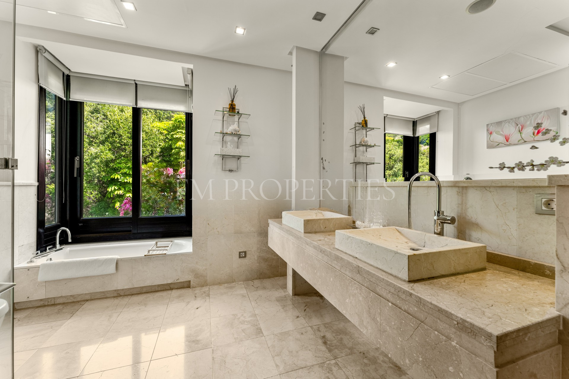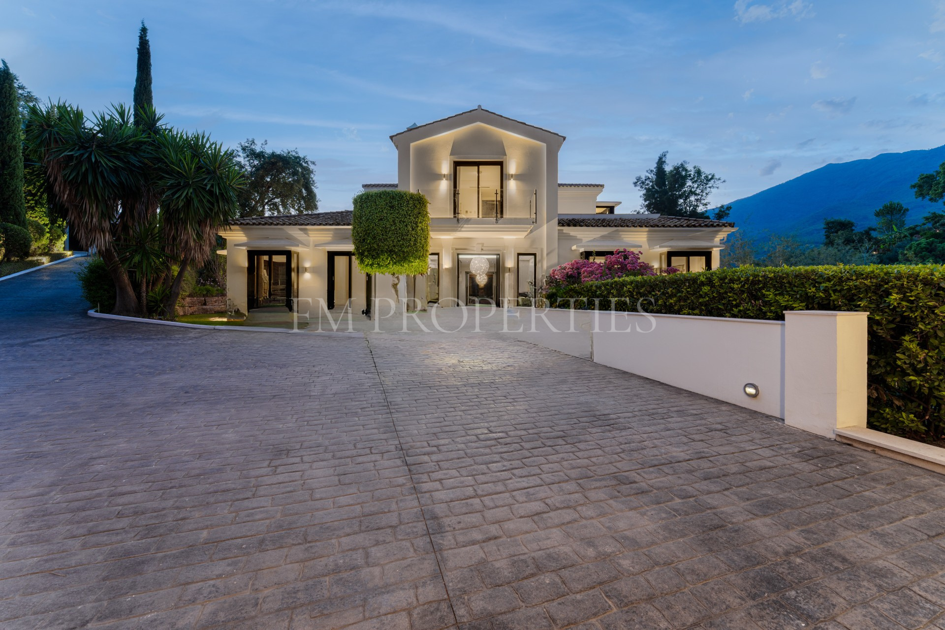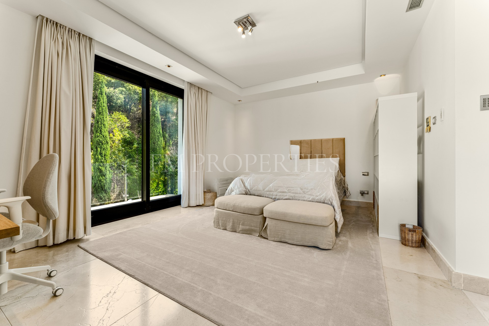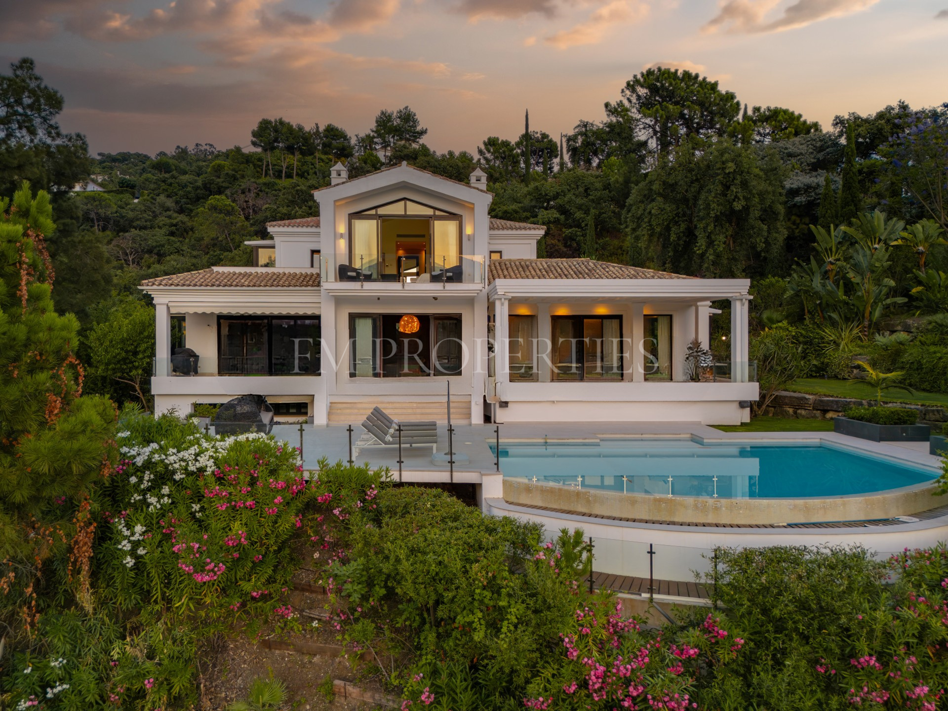 Every detail of this villa has been conceived to offer an unparalleled living experience: wine cellar, private cinema, gym, sauna, bar, staff apartment, and a garage for three cars. The exterior is equally remarkable, with mature landscaped gardens surrounding a stunning heated infinity pool, hardwood terraces, and charming corners to enjoy the Costa del Sol’s exceptional climate.