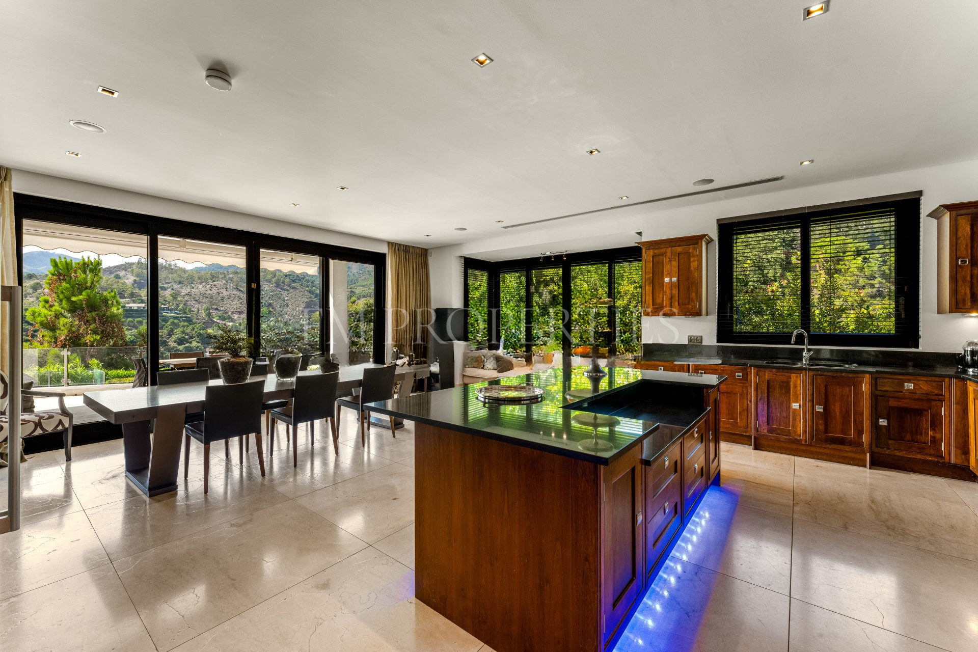 With a built area of 983 m² on a 4,418 m² plot, this residence masterfully combines space, design, and comfort. The flowing layout includes a grand living room with fireplace, a state-of-the-art gourmet kitchen, and multiple indoor and outdoor areas designed for relaxation and entertaining. The property features six spacious bedrooms and six bathrooms, along with guest toilets — all finished with noble materials such as marble and iroko wood, complemented by carefully curated lighting for a warm, refined ambiance.