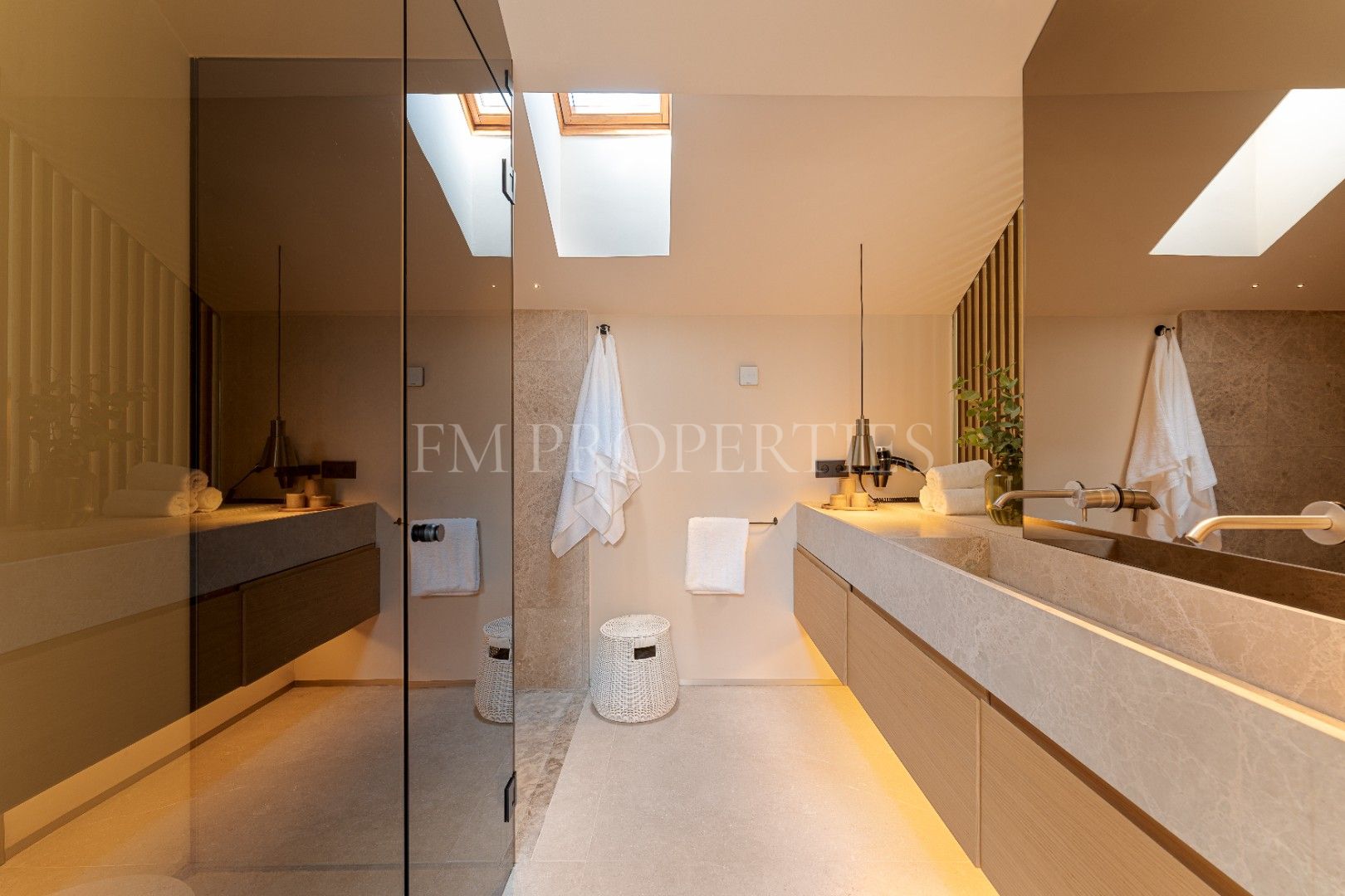 This duplex has been fully renovated to high standards and equipped with state-of-the-art features, including air conditioning with an Air Zone system, underfloor heating, LED lighting, an integrated music system, and automated curtains, all easily controlled via a smart home automation system. Natural wood elements complement the clean lines, and integrated technology such as electric blinds and a smart security system with double-glazing and security shutters ensures a balance of ease and safety.