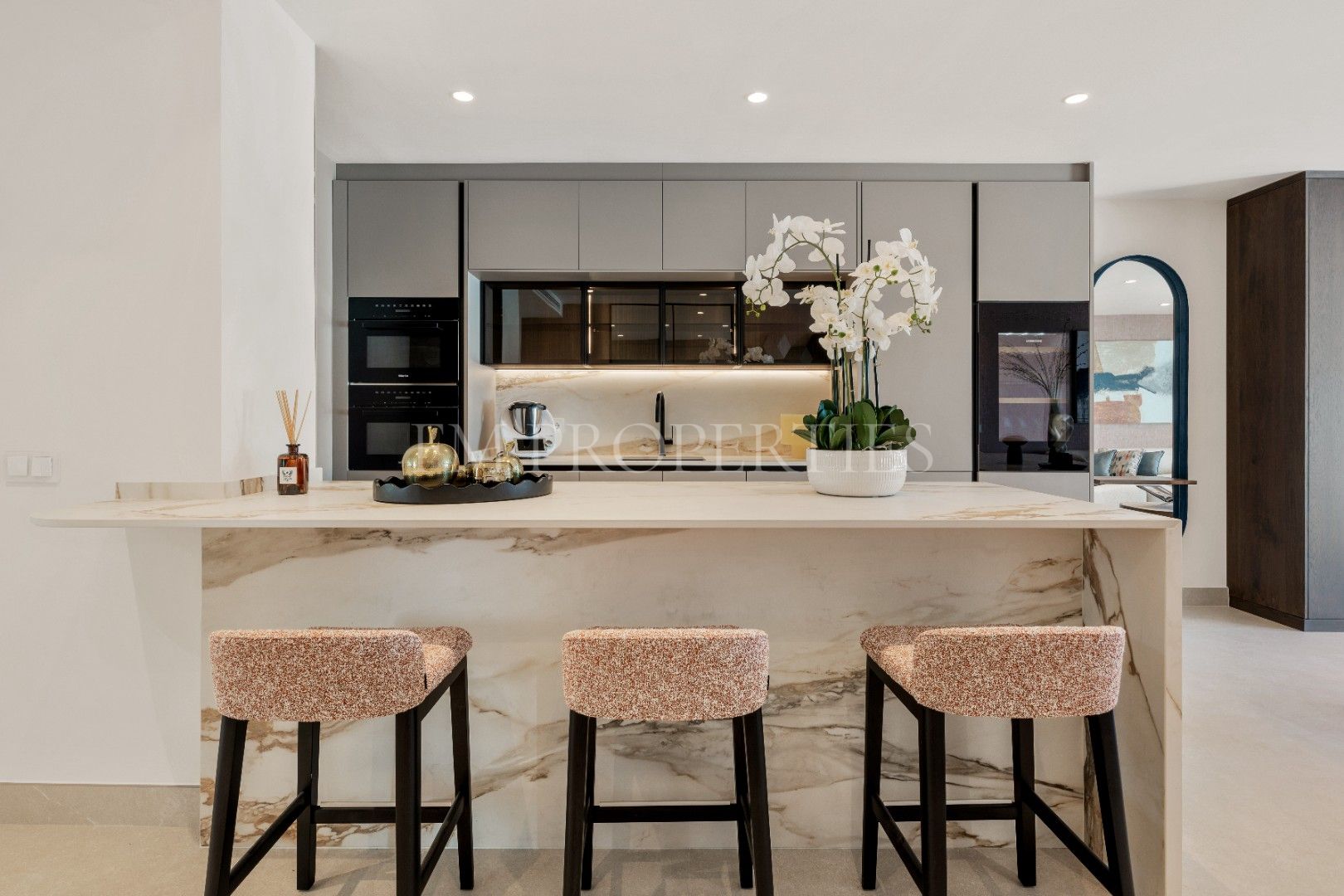 The property comprises 130 m² built plus 30 m² of terrace, distributed across three bedrooms and two bathrooms. The open-plan living room integrates with a designer kitchen fitted with high-end German appliances and an elegant dining area, extending onto a southwest-facing terrace with views of the sea, the golf course, subtropical gardens, and La Concha mountain.