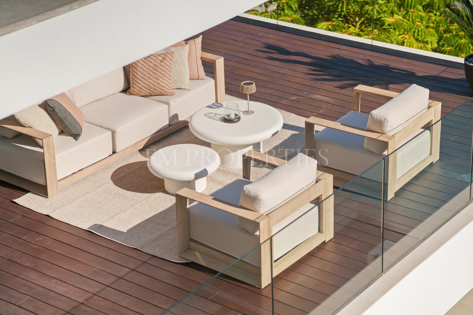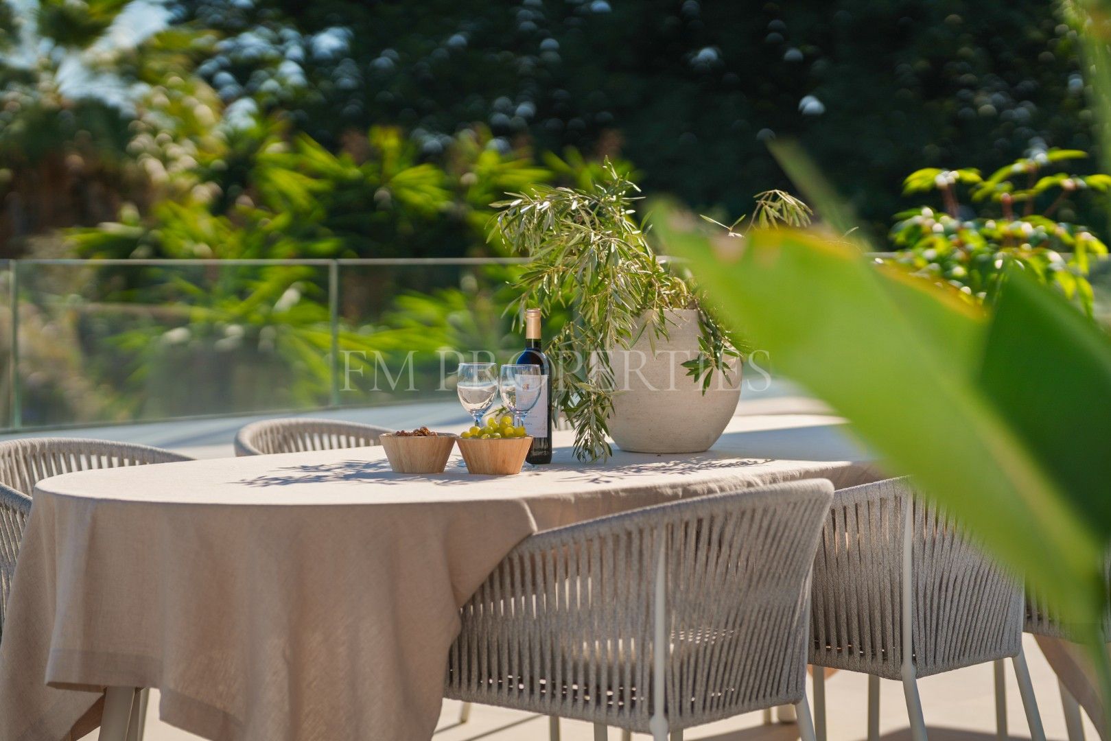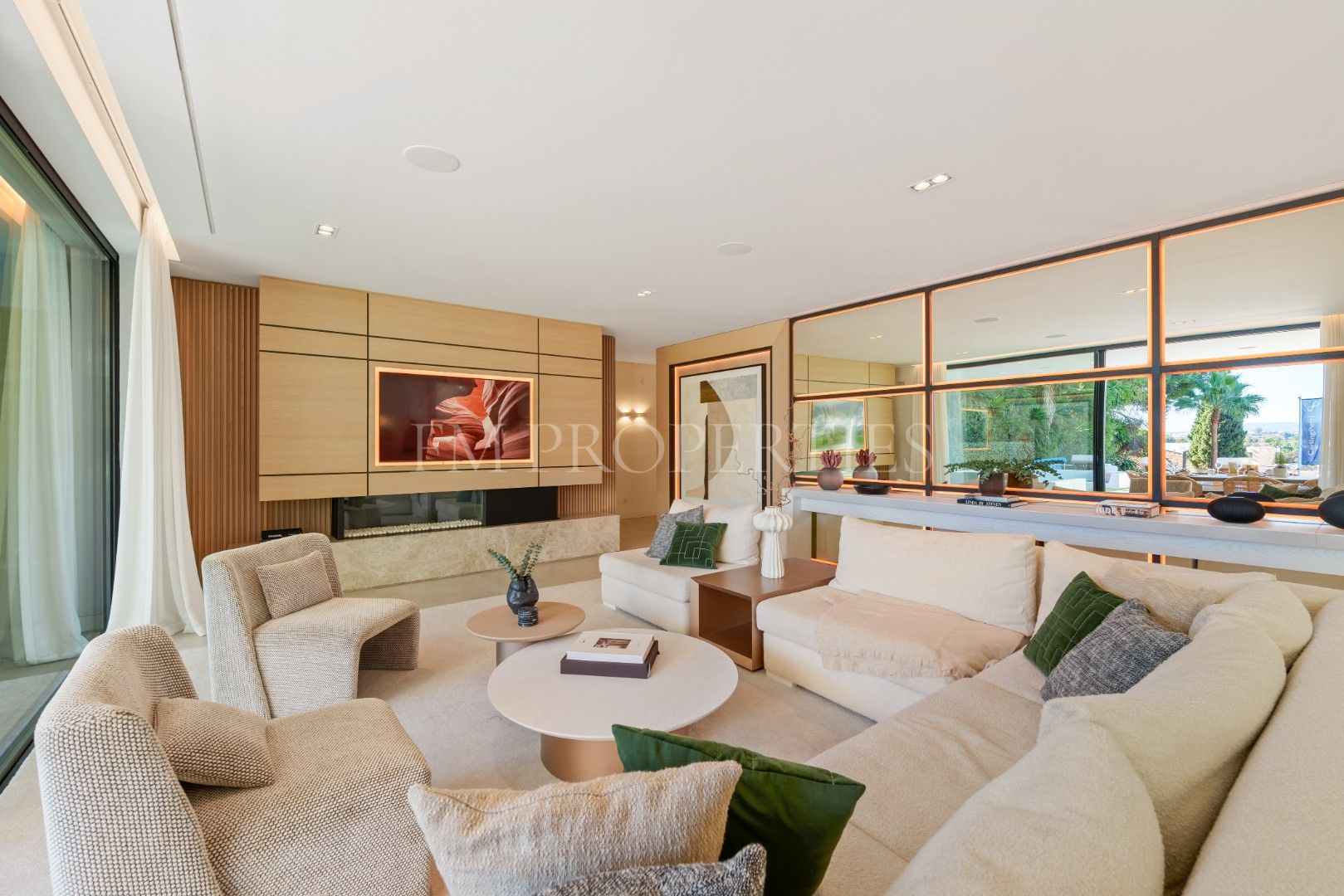 With 556 m² built, 418 m² of terraces, and 5 bedrooms and 6 bathrooms, the property showcases an elegant, open and functional design. Premium materials, clean lines and carefully curated interiors create a warm, aesthetic and balanced atmosphere. The main living area flows naturally outdoors through expansive glass doors, while the refined, fully equipped kitchen connects effortlessly to the dining area and terrace—ideal for year-round Mediterranean living. Each bedroom has been conceived as a private retreat, offering tranquillity, comfort and an intimate connection with the surroundings.