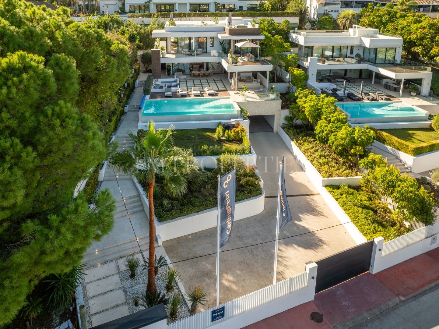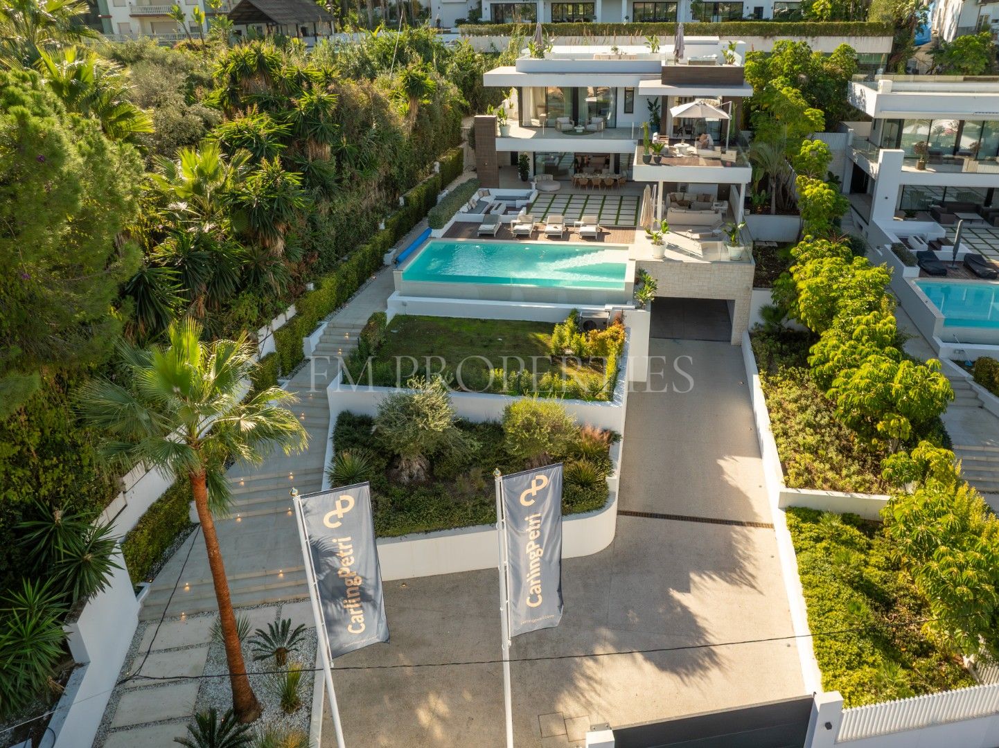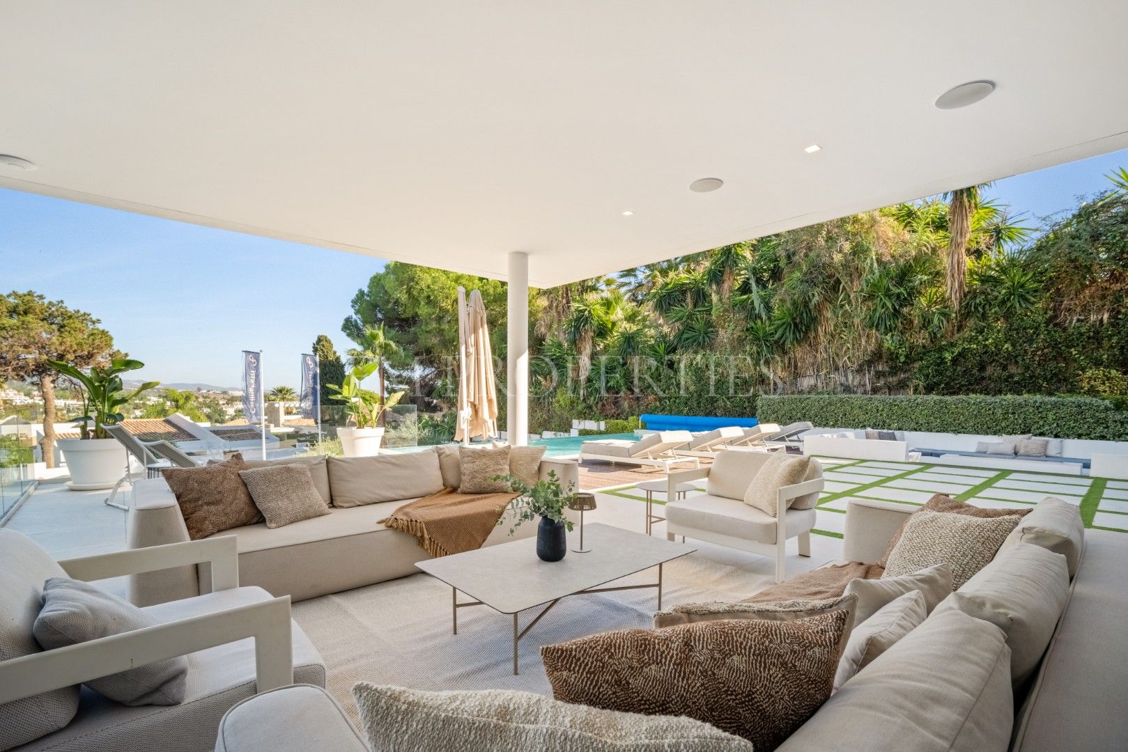 With 556 m² built, 418 m² of terraces, and 5 bedrooms and 6 bathrooms, the property showcases an elegant, open and functional design. Premium materials, clean lines and carefully curated interiors create a warm, aesthetic and balanced atmosphere. The main living area flows naturally outdoors through expansive glass doors, while the refined, fully equipped kitchen connects effortlessly to the dining area and terrace—ideal for year-round Mediterranean living. Each bedroom has been conceived as a private retreat, offering tranquillity, comfort and an intimate connection with the surroundings.