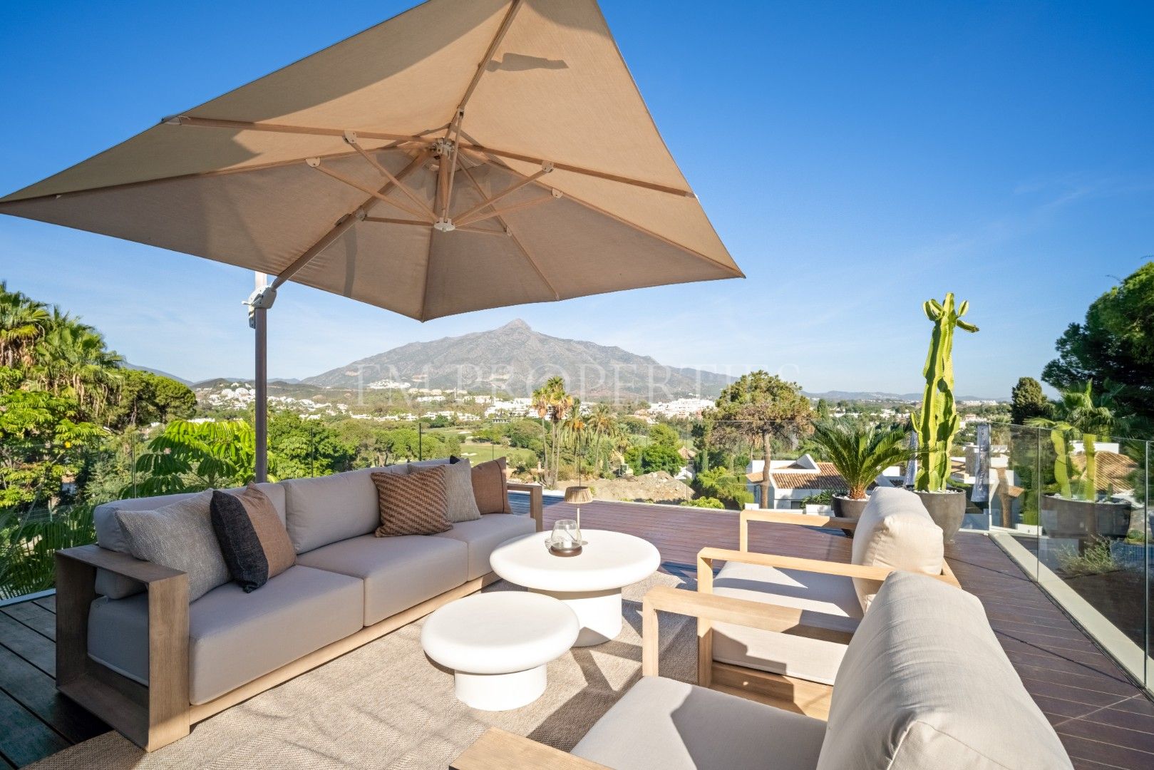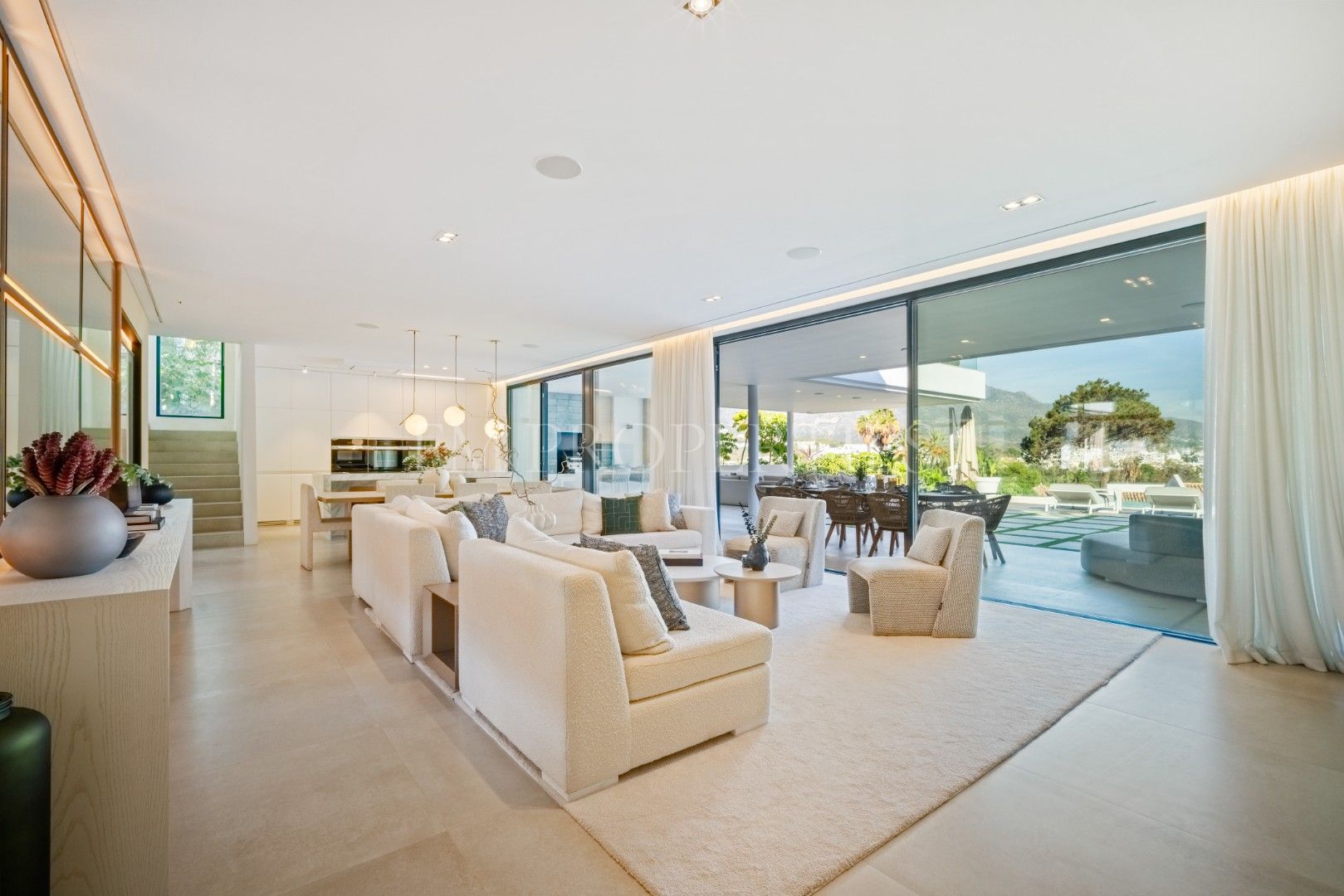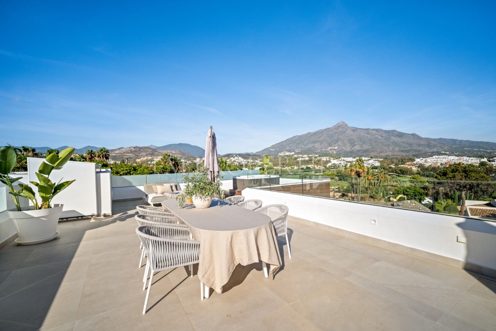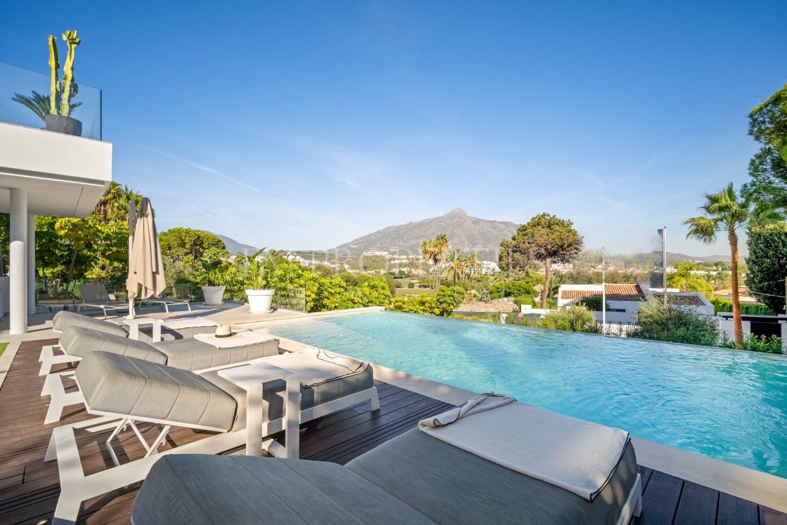 In the heart of Nueva Andalucía’s prestigious Golf Valley, this stunning contemporary villa in Nueva Andalucía rises as a modern sanctuary where light, landscape and architecture blend in perfect harmony. From its elevated terraces, the silhouette of La Concha becomes the backdrop of everyday life, while the infinity pool seems to merge with the horizon. Here, warm morning light enhances each day thanks to its east-facing orientation, and evenings are infused with serenity, privacy and the vibrant lifestyle that defines this privileged area of Marbella.