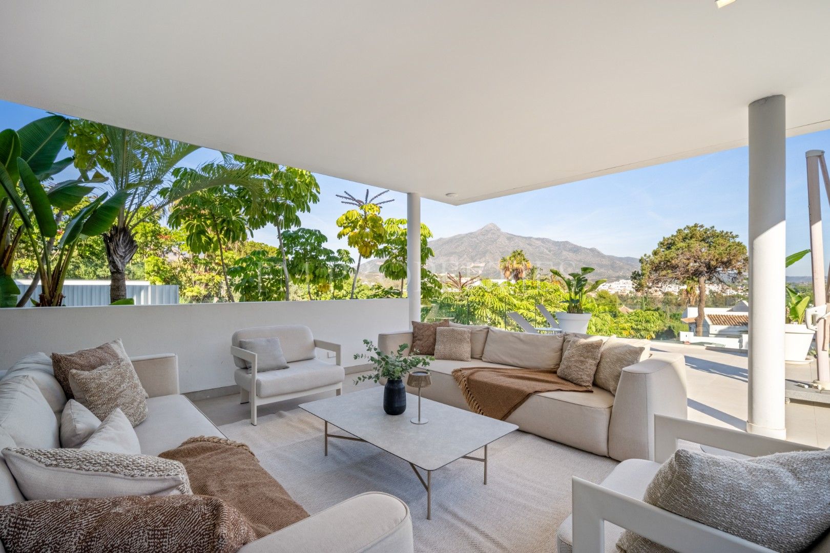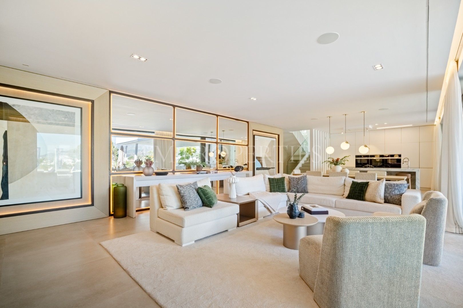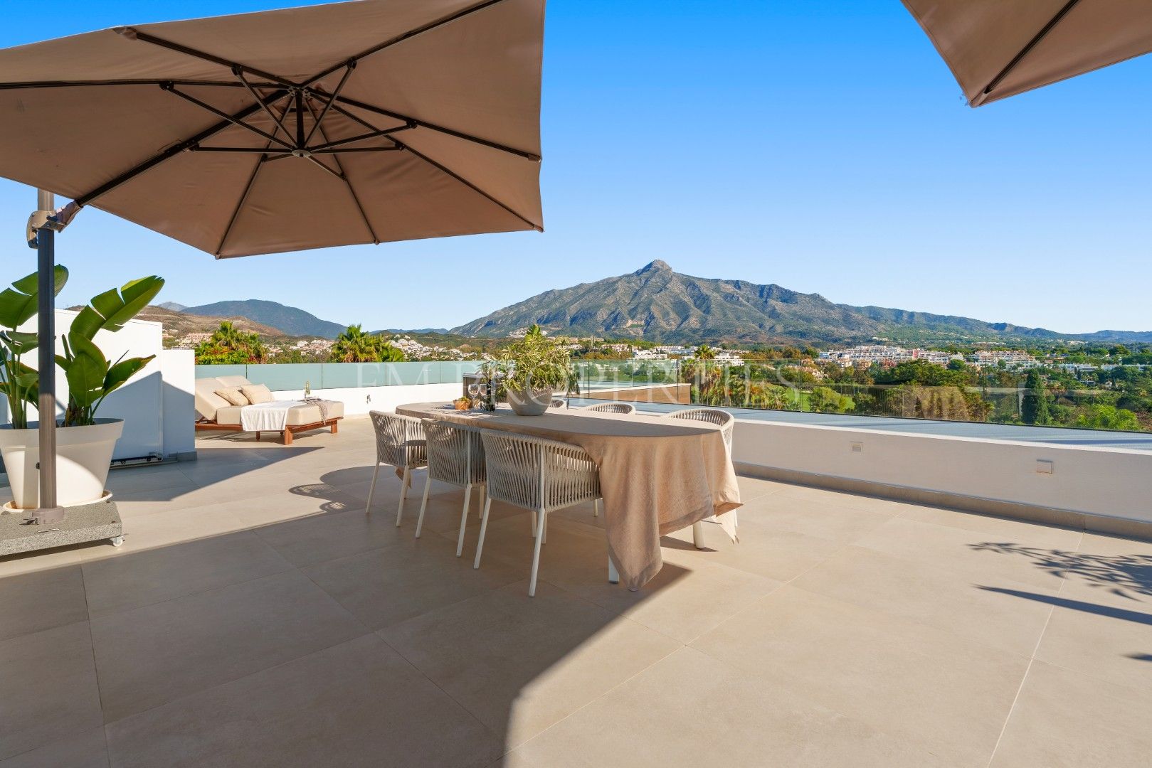 In the heart of Nueva Andalucía’s prestigious Golf Valley, this stunning contemporary villa in Nueva Andalucía rises as a modern sanctuary where light, landscape and architecture blend in perfect harmony. From its elevated terraces, the silhouette of La Concha becomes the backdrop of everyday life, while the infinity pool seems to merge with the horizon. Here, warm morning light enhances each day thanks to its east-facing orientation, and evenings are infused with serenity, privacy and the vibrant lifestyle that defines this privileged area of Marbella.