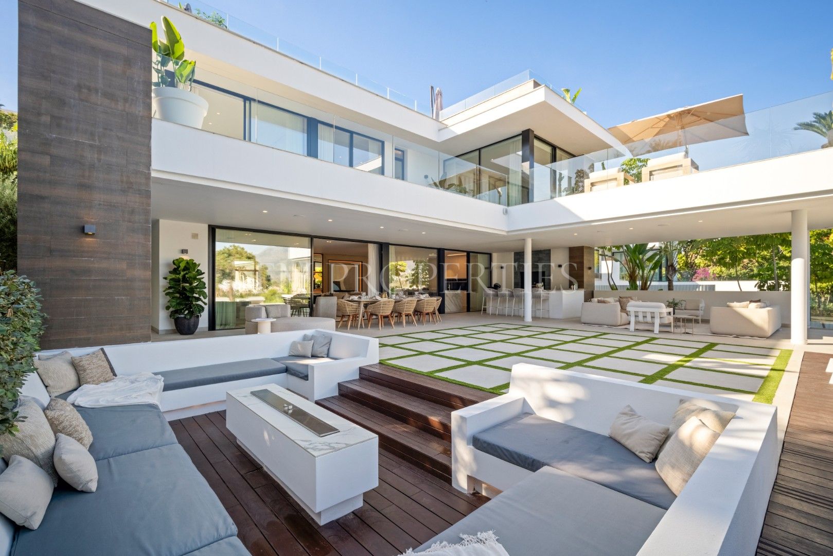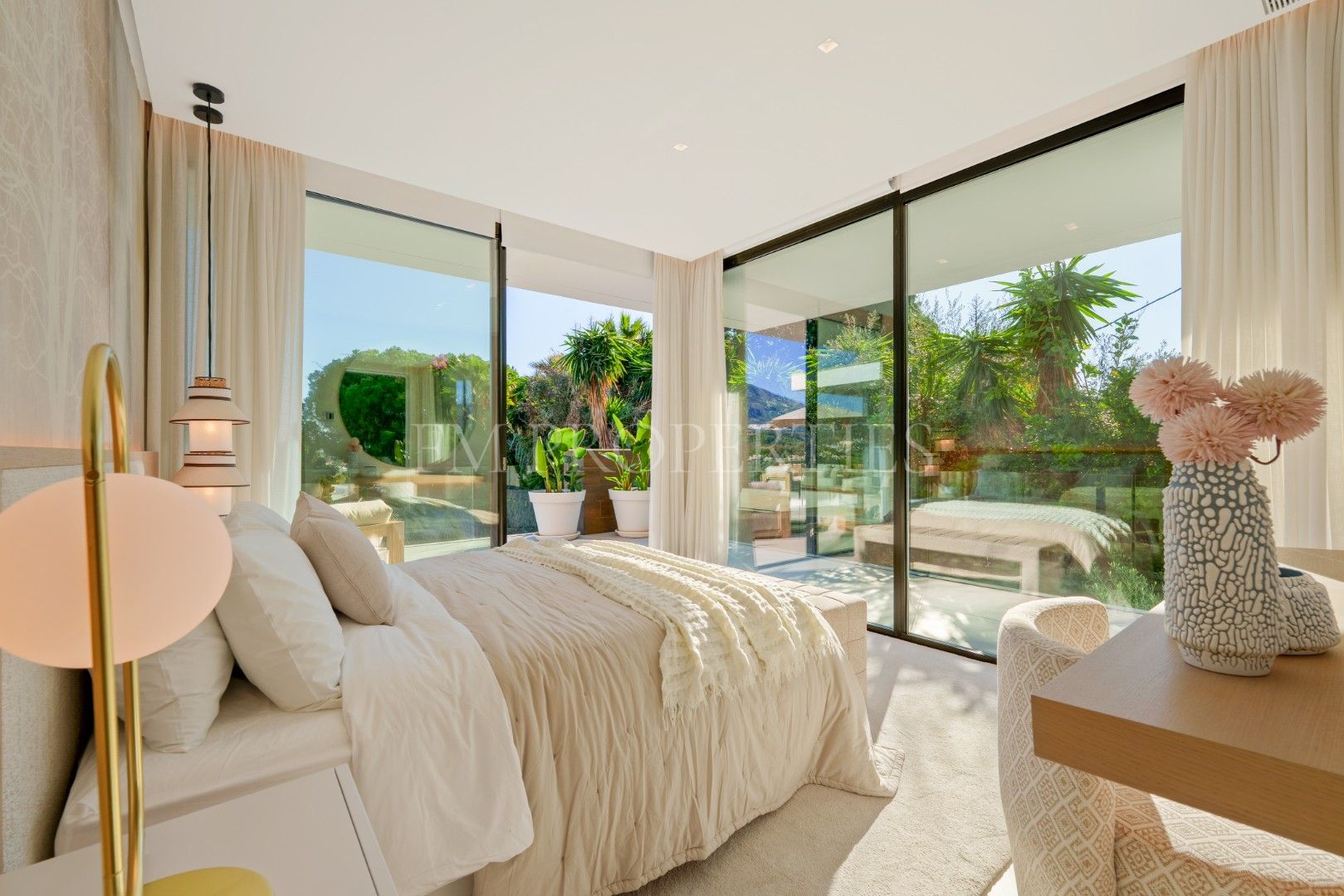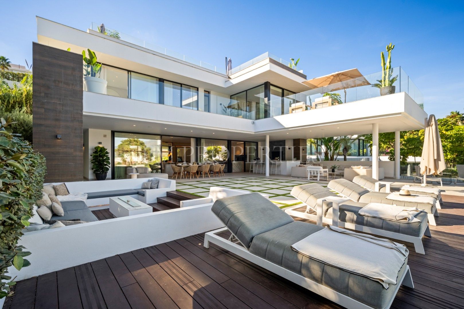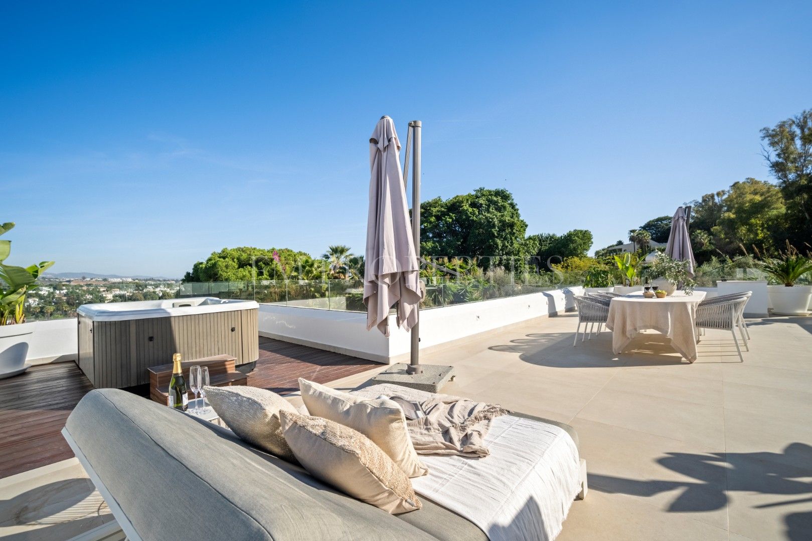 In the heart of Nueva Andalucía’s prestigious Golf Valley, this stunning contemporary villa in Nueva Andalucía rises as a modern sanctuary where light, landscape and architecture blend in perfect harmony. From its elevated terraces, the silhouette of La Concha becomes the backdrop of everyday life, while the infinity pool seems to merge with the horizon. Here, warm morning light enhances each day thanks to its east-facing orientation, and evenings are infused with serenity, privacy and the vibrant lifestyle that defines this privileged area of Marbella.