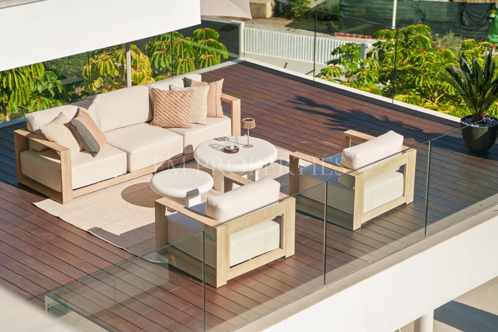 Among its standout features are the infinity pool, a rooftop solarium with jacuzzi, beautifully landscaped gardens that ensure privacy, and generous terraces designed for outdoor living every day of the year. The villa also includes a private garage with capacity for up to four cars, as well as outdoor areas perfect for hosting, relaxing or entertaining. Its contemporary architecture, paired with refined interiors and tasteful furnishings, transforms every space into a modern luxury experience.