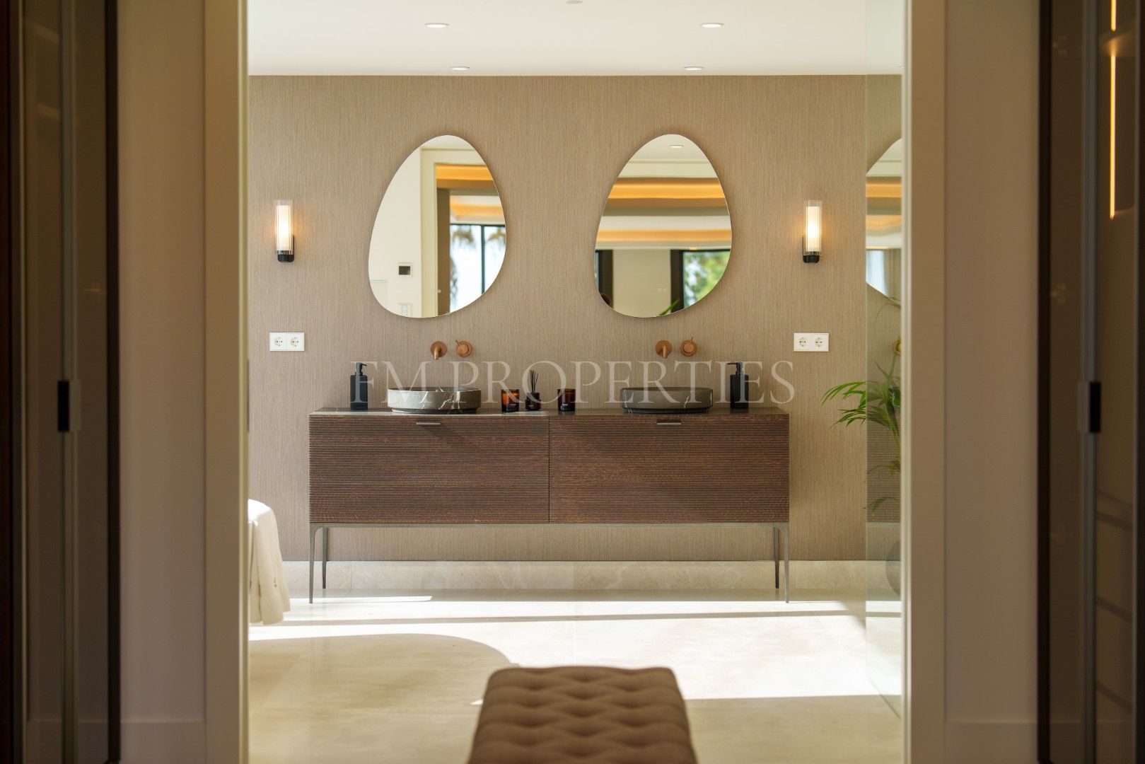 This stunning villa in Rocío de Nagüeles, Marbella Golden Mile is designed for those who seek elegance and functionality: private gated access leads to a covered carport with space for six vehicles. All this just minutes away from exclusive beach clubs, world-class golf courses and the five-star amenities of the Golden Mile, home to designer boutiques, fine dining restaurants and iconic hotels.