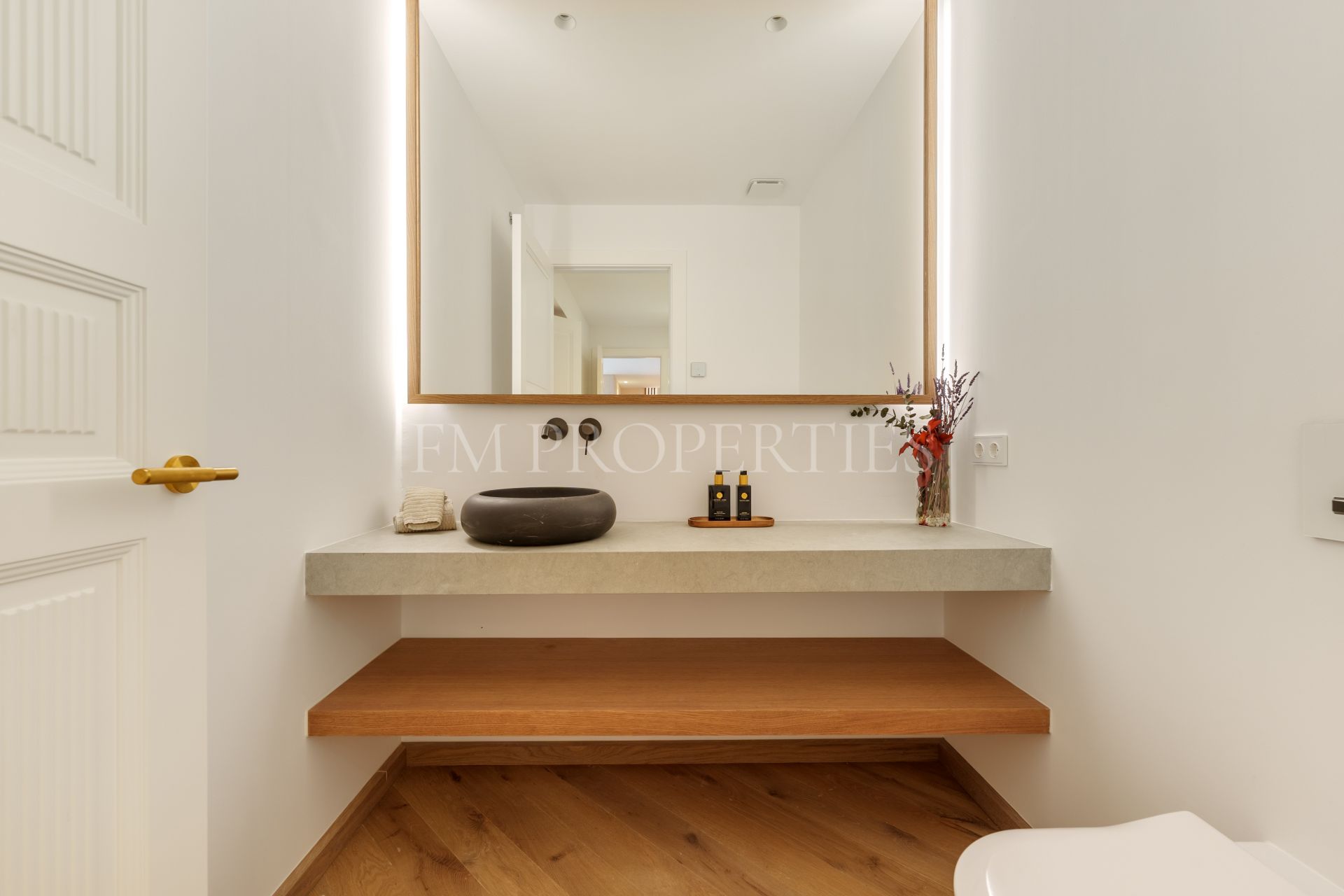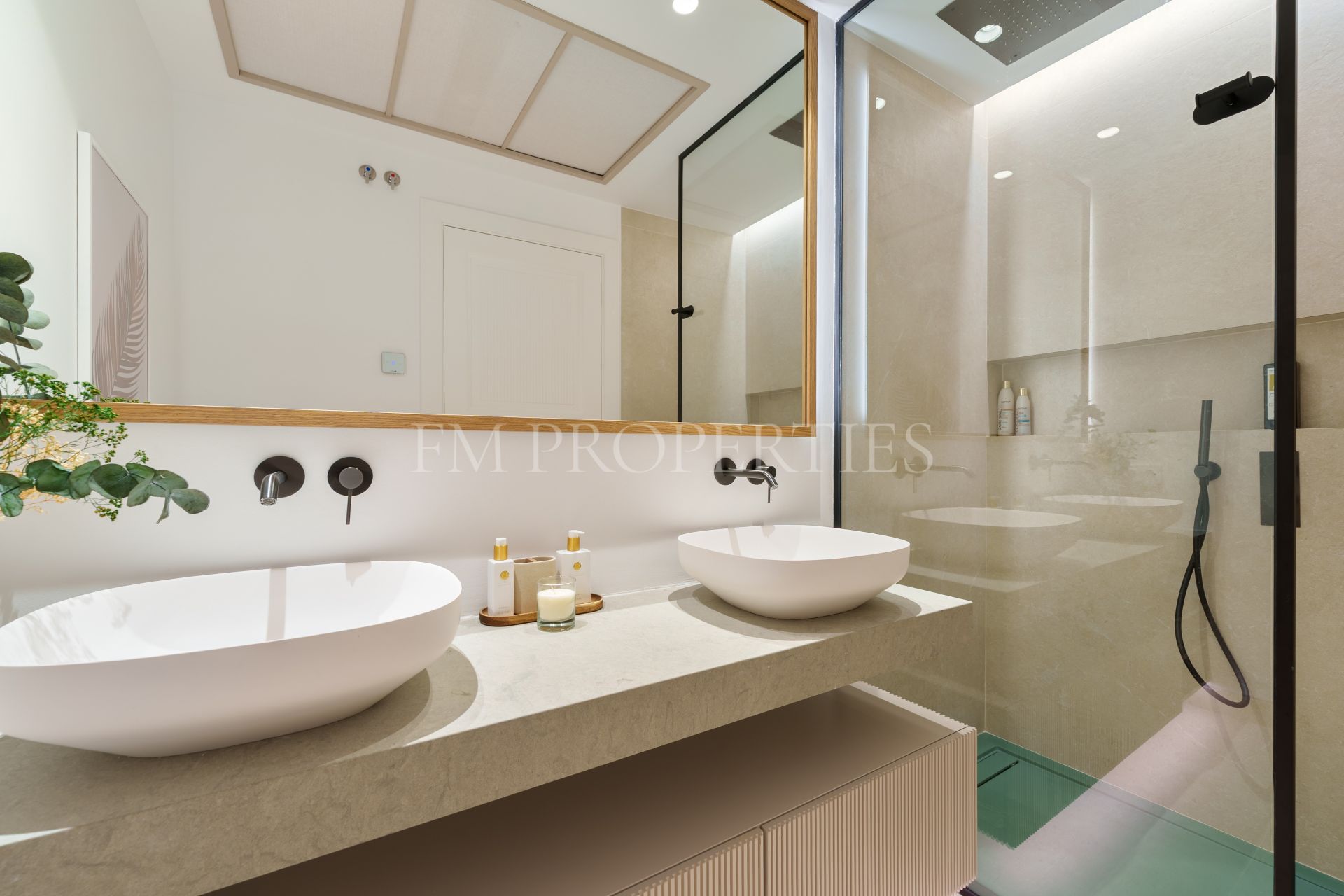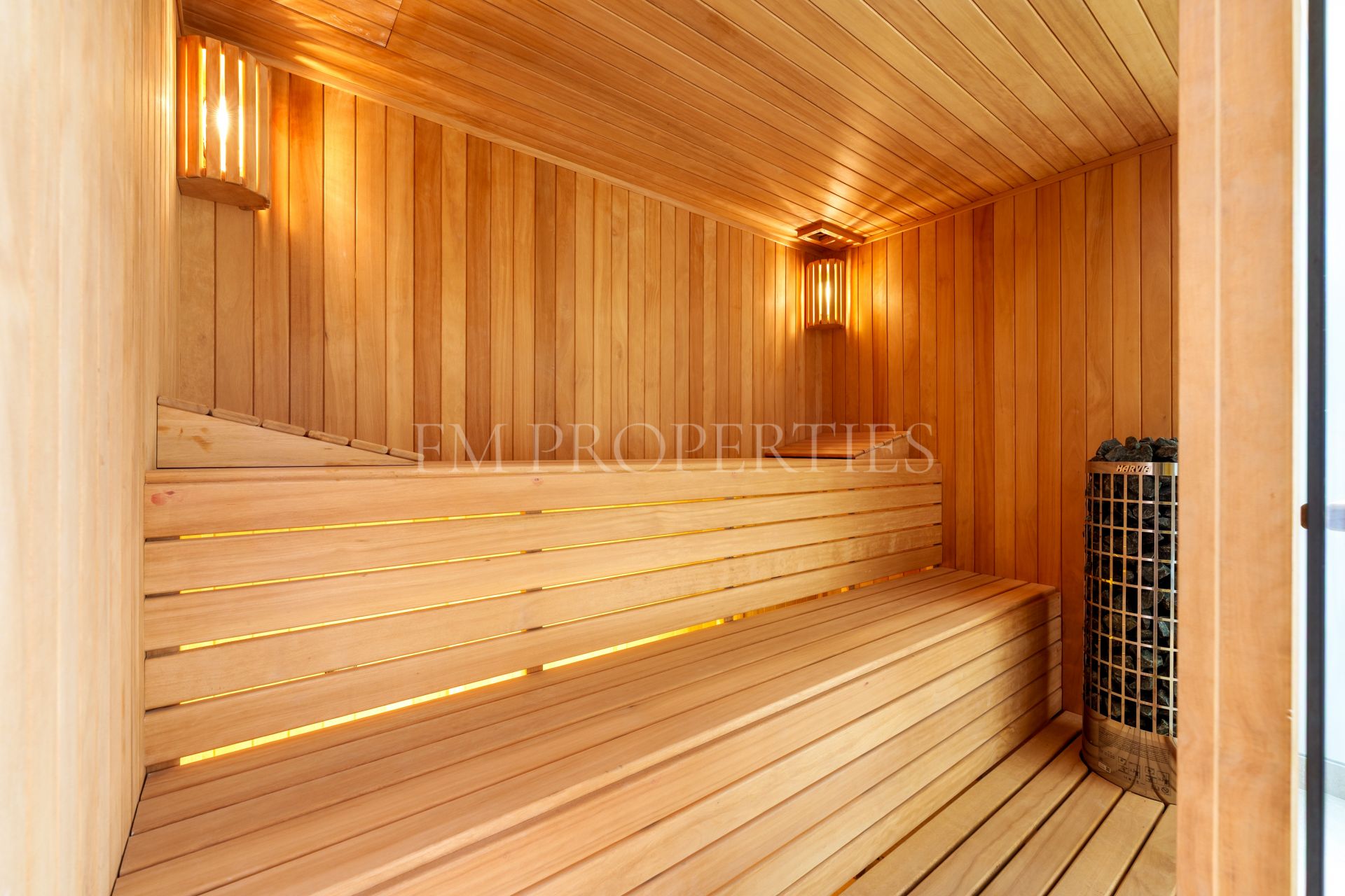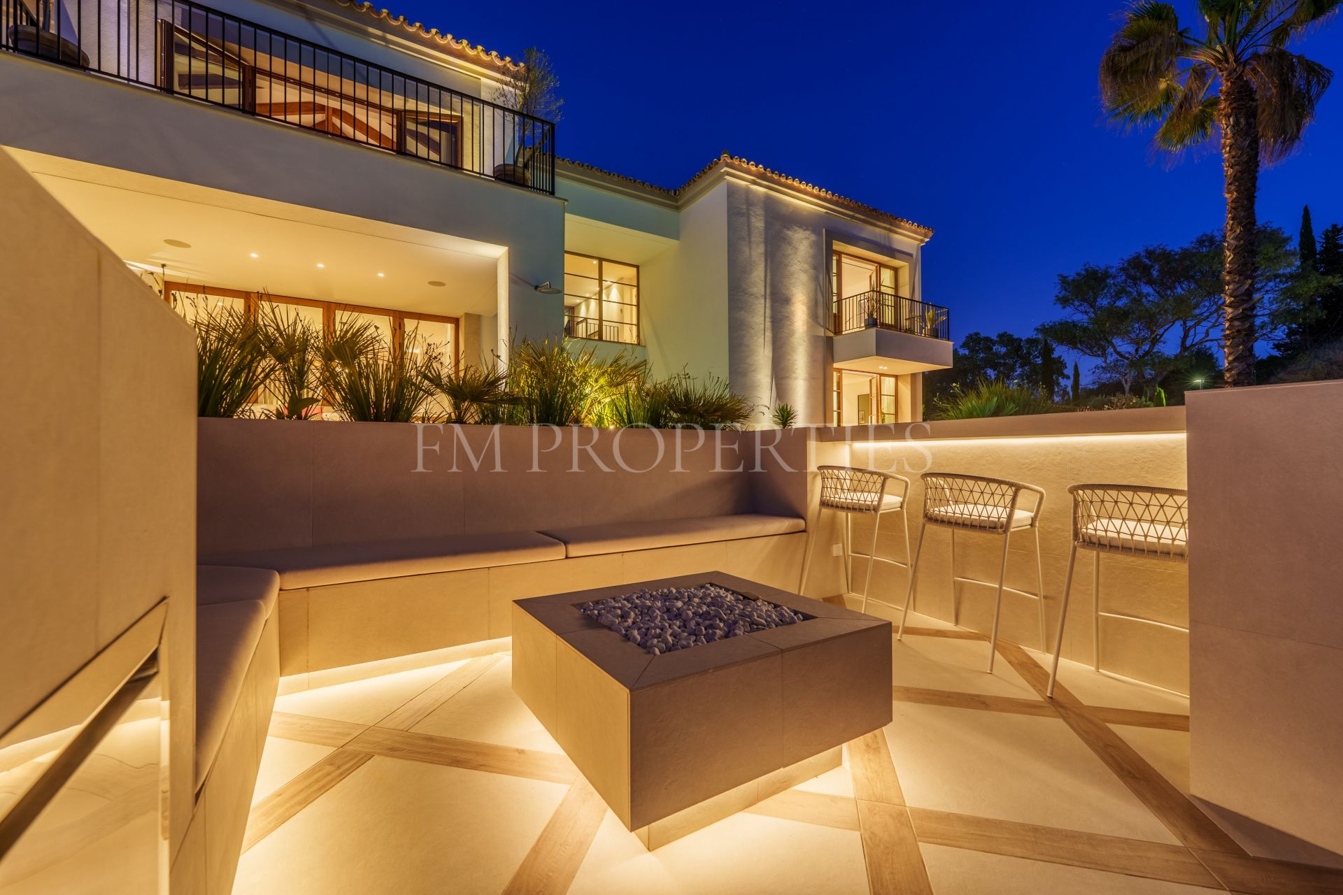 This elegant 5-bedroom villa is individually designed and features en-suite bathrooms, spacious and bright living areas with a fireplace, and a state-of-the-art kitchen. The master suite includes a south-facing terrace, and all four guest bedrooms are also en-suite. Additional highlights include a wine cellar, entertainment room, gym, massage room, three guest toilets, a laundry room with four machines, and now a private elevator that adds convenience and comfort to everyday living. The private saltwater pool is complemented by a south-facing terrace, lounge area, a fully equipped outdoor BBQ kitchen, and a stylish chill-out zone—perfect for embracing the Mediterranean lifestyle.