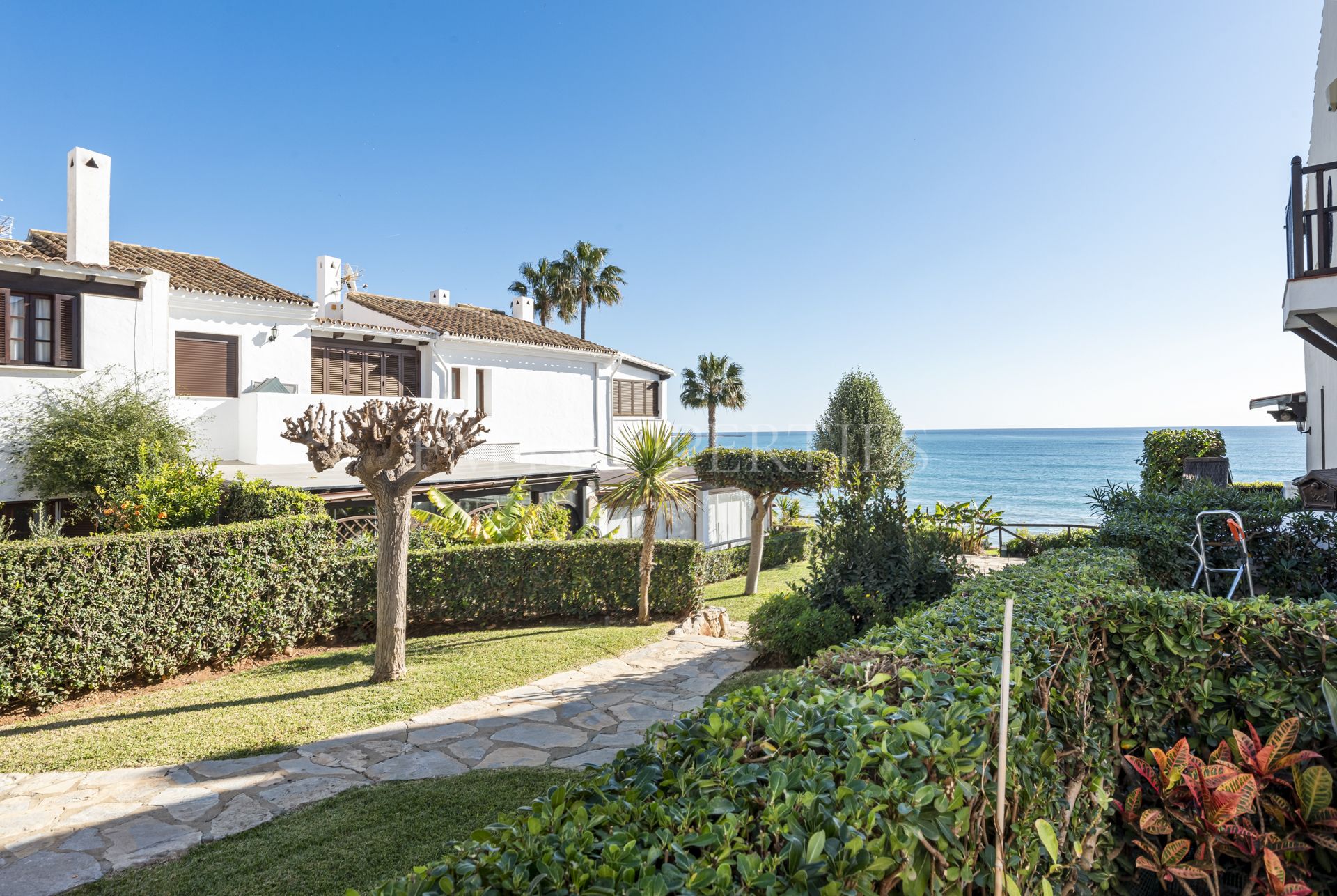 Despertar con la brisa del mar y caminar hasta la orilla en cuestión de minutos: así se vive en esta encantadora casa adosada en primera línea de playa en Bahía Azul, Estepona. Situada en una de las zonas más codiciadas de la Costa del Sol, esta propiedad ofrece el equilibrio perfecto entre tranquilidad costera, comodidad y potencial de renovación, ideal para quienes buscan crear su propio refugio junto al mar.