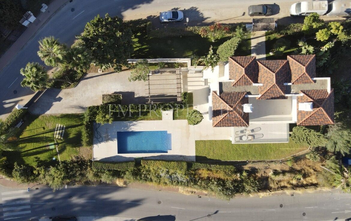 Esta villa de estilo andaluz-mediterráneo moderno se levanta sobre una parcela en esquina de 1.377 m², con un amplio acceso privado y capacidad de aparcamiento para entre 4 y 6 vehículos. Al entrar por la gran puerta pivotante de madera, la primera impresión es inmejorable: techos altos con vigas de madera y una espectacular vista directa al mar desde el primer momento. Una propiedad excepcional con vistas al mar desde todas las plantas y desde cada estancia, incluido el sótano.