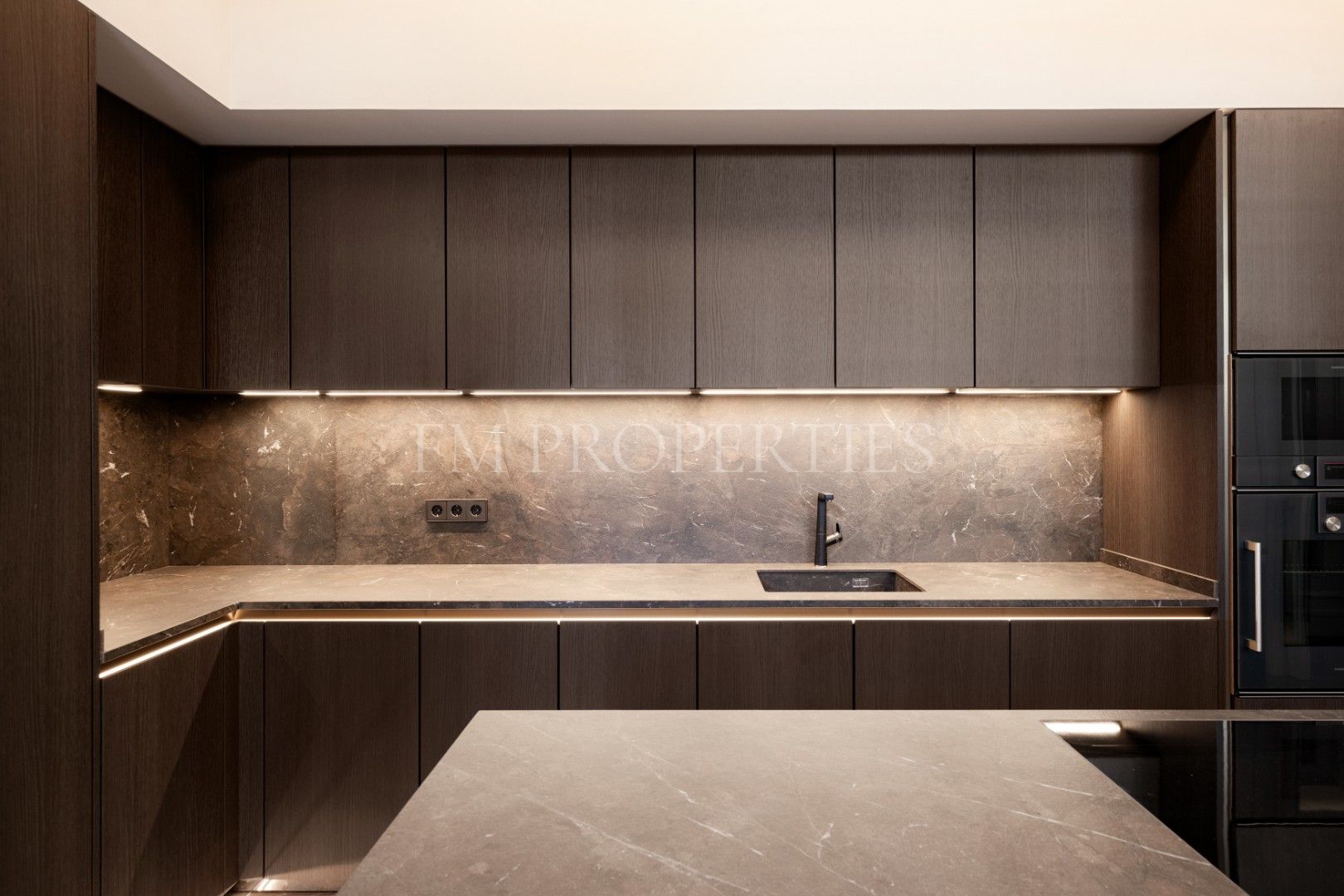 Con una distribución impecable, la villa se desarrolla en cuatro niveles conectados por un ascensor en tono champán. El impresionante acceso de doble altura se abre a interiores diáfanos con techos revestidos en madera y transiciones fluidas entre interior y exterior. La cocina Siematic, equipada con electrodomésticos Gaggenau, se adapta fácilmente gracias a sus puertas correderas, mientras que los ventanales de suelo a techo inundan los espacios de luz natural. La residencia cuenta con cinco dormitorios y cinco baños en suite, cada uno diseñado con elegancia contemporánea que equilibra a la perfección confort y distinción.