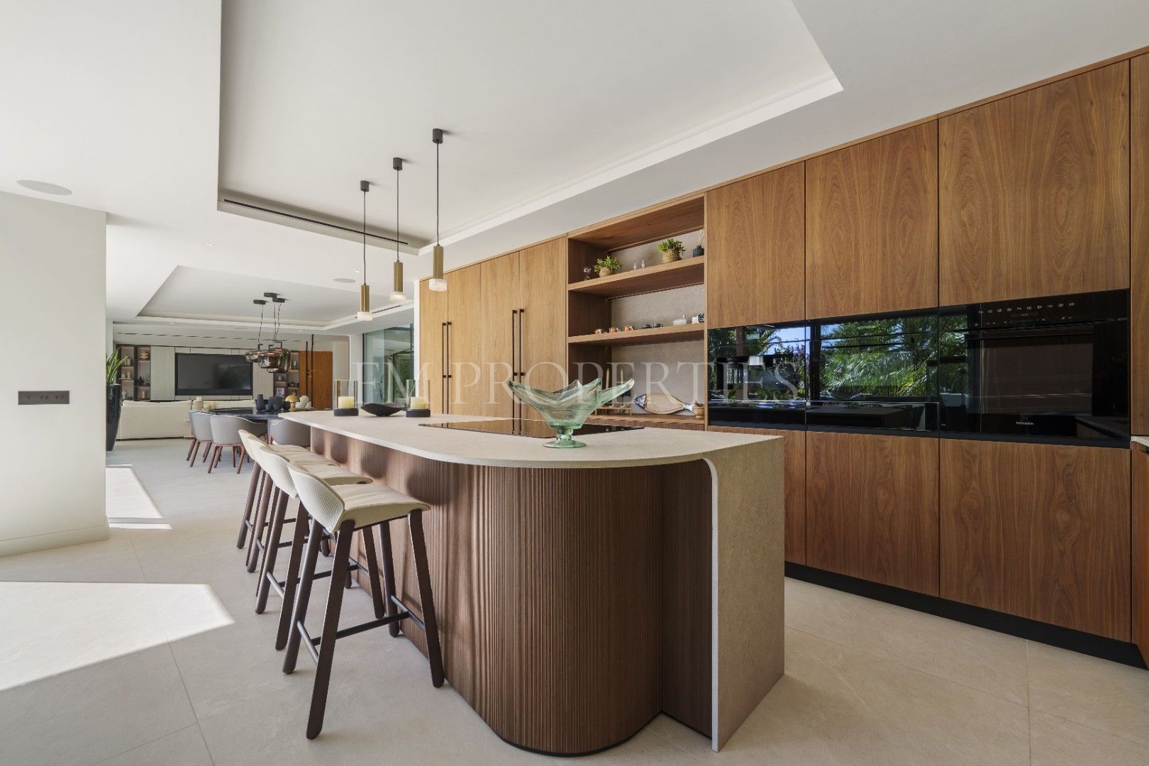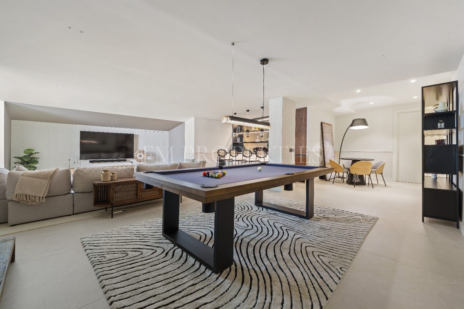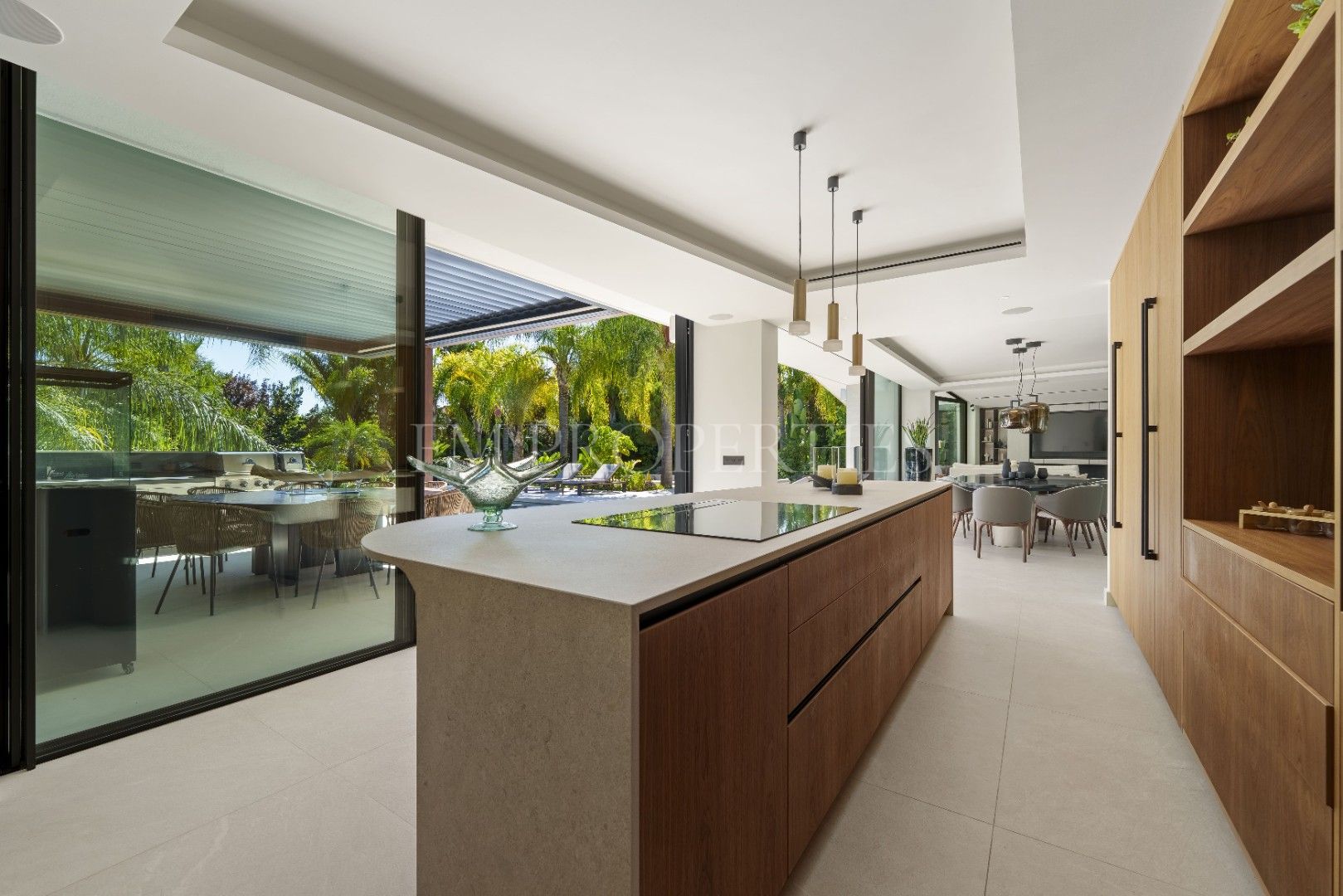 Con 837 m² construidos y un terreno de 1.573 m², esta villa de lujo cuenta con 5 dormitorios, cada uno con su propio baño en suite. El diseño abierto conecta perfectamente el salón, comedor y cocina, creando un ambiente fluido que se extiende a las terrazas exteriores gracias a sus grandes puertas correderas de vidrio. El dormitorio principal, con un baño en suite de diseño, incluye una bañera independiente y una doble lavamanos, todo con detalles arquitectónicos en madera que ofrecen privacidad sin perder amplitud. La villa también incluye una sala de entretenimiento en el sótano, ideal para reuniones sociales, con un bar y mesa de billar.