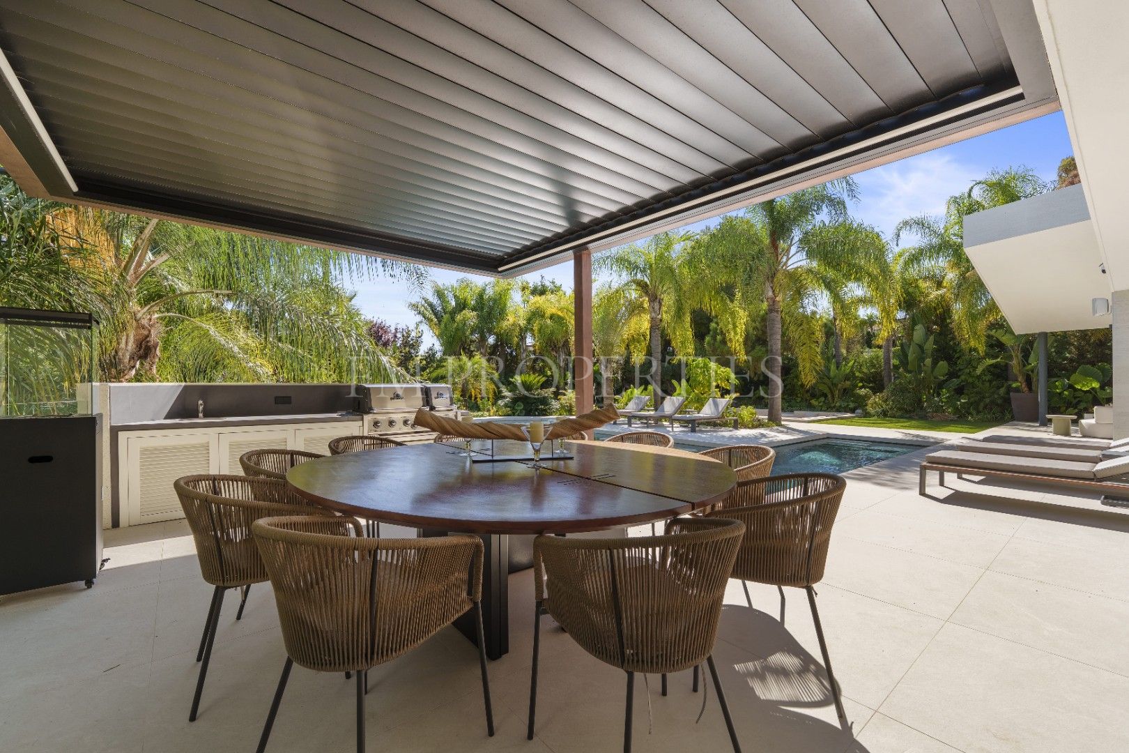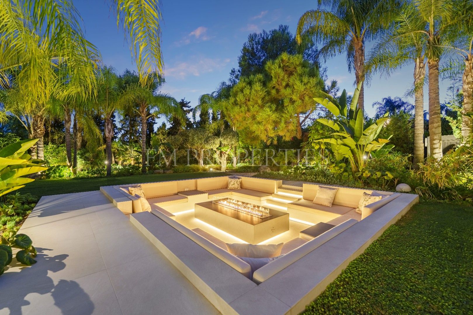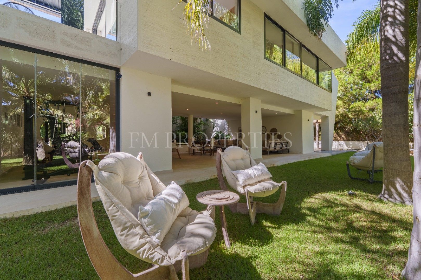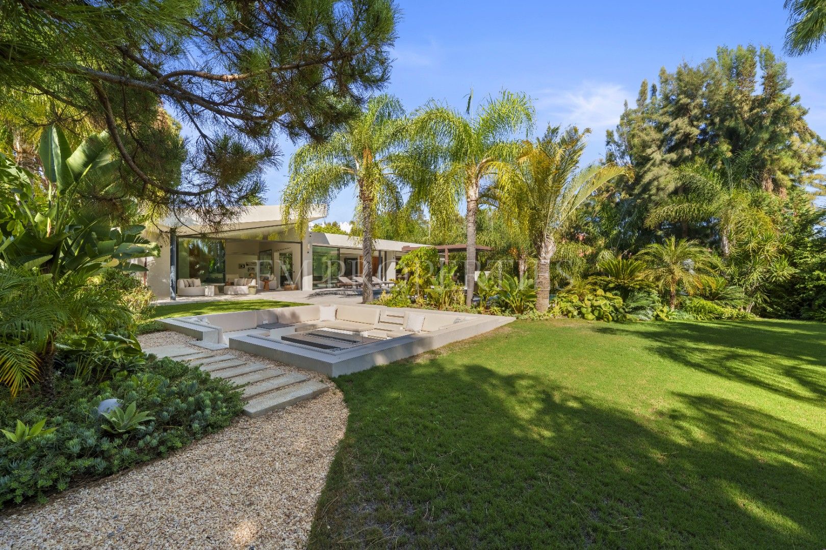 El exterior de Las Chapas 5 destaca por sus jardines maduros con palmeras, ofreciendo varias áreas de descanso y una piscina central rodeada de piedras y tumbonas. Además, cuenta con una terraza cubierta de comedor y un salón al aire libre con una chimenea hundida, creando ambientes acogedores tanto para el día como para la noche. El diseño de la villa asegura privacidad y, al mismo tiempo, maximiza la disfrute del clima de Marbella.
