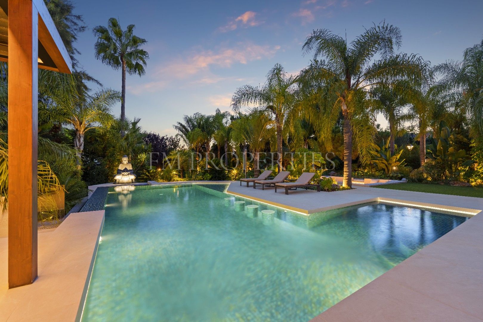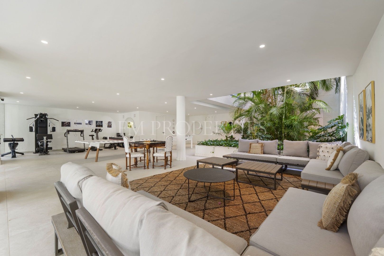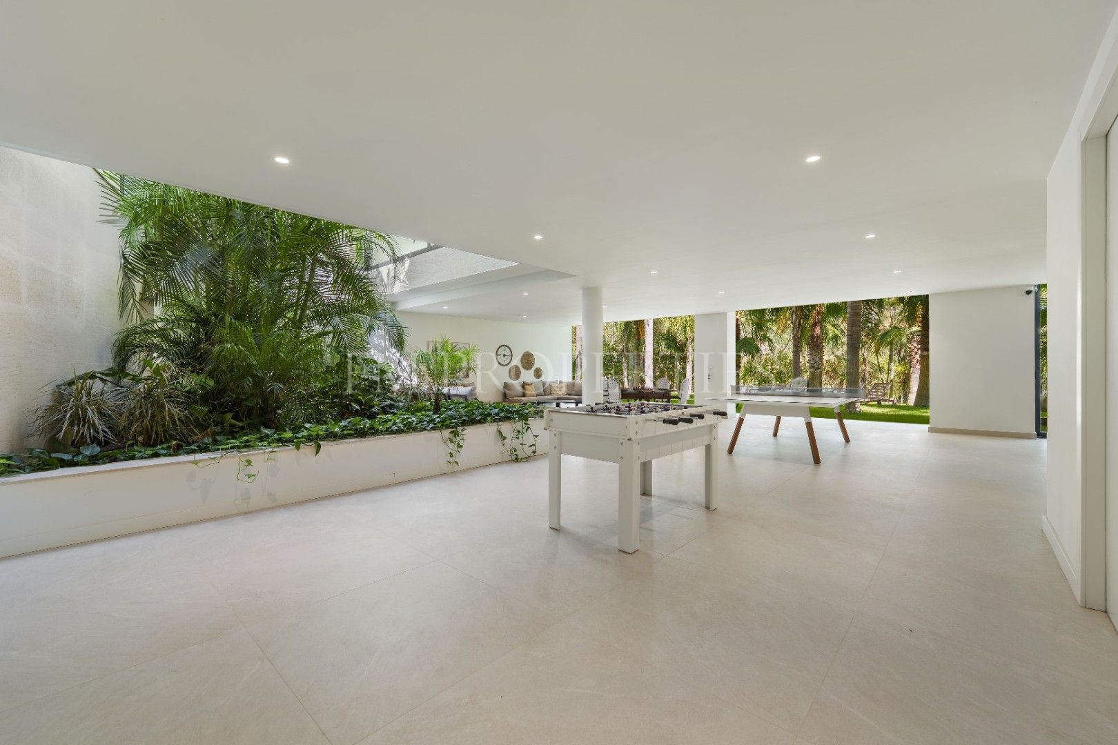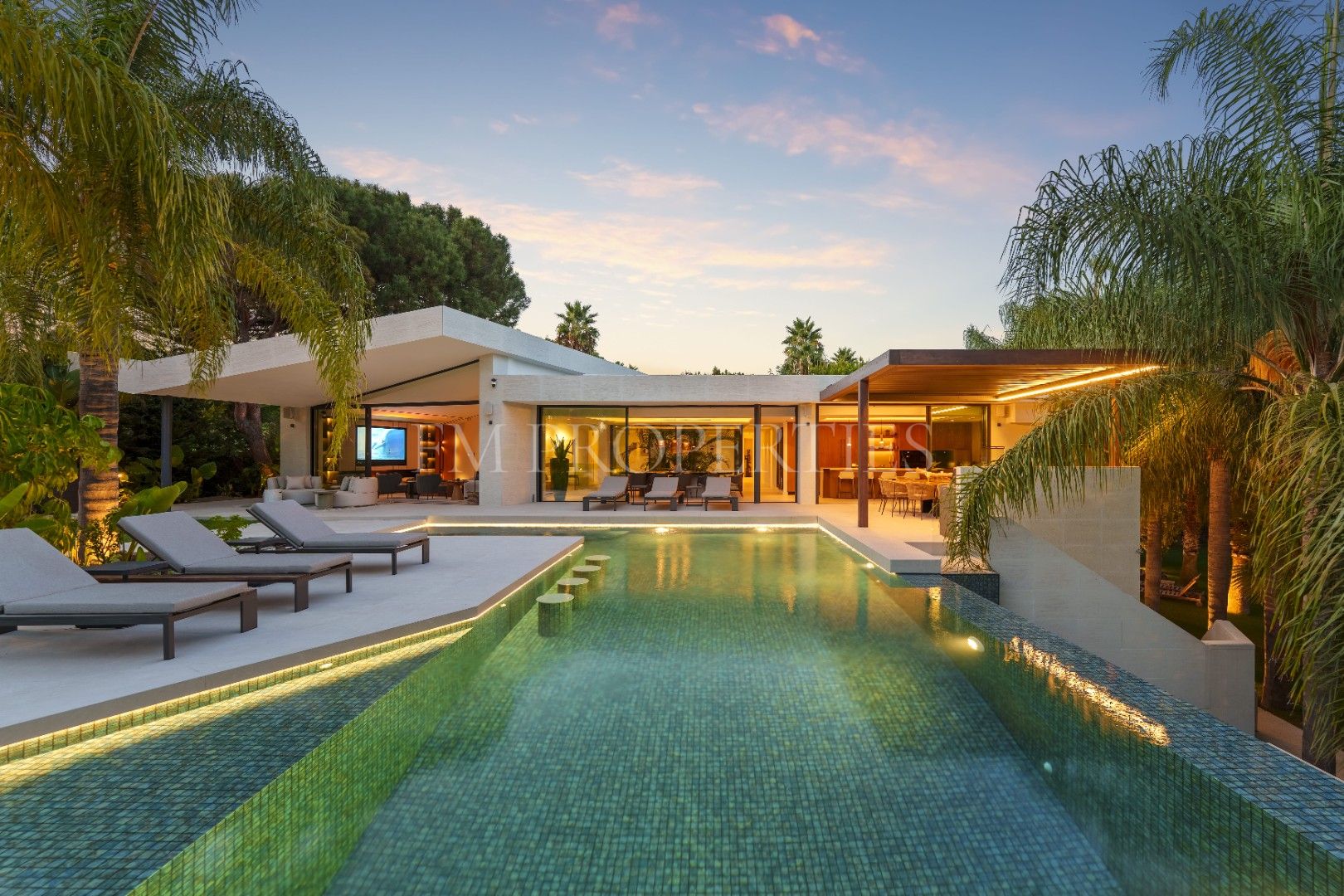 El exterior de Las Chapas 5 destaca por sus jardines maduros con palmeras, ofreciendo varias áreas de descanso y una piscina central rodeada de piedras y tumbonas. Además, cuenta con una terraza cubierta de comedor y un salón al aire libre con una chimenea hundida, creando ambientes acogedores tanto para el día como para la noche. El diseño de la villa asegura privacidad y, al mismo tiempo, maximiza la disfrute del clima de Marbella.