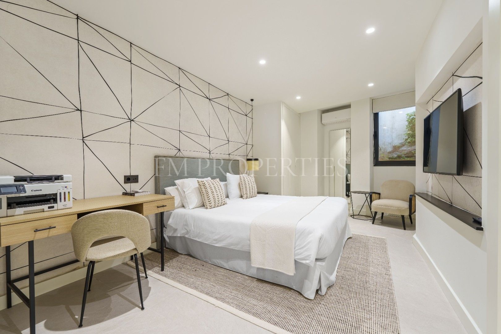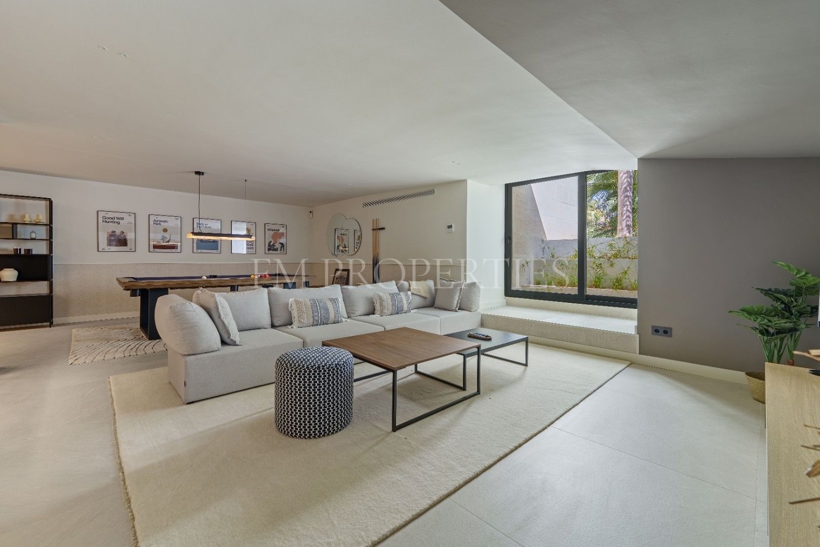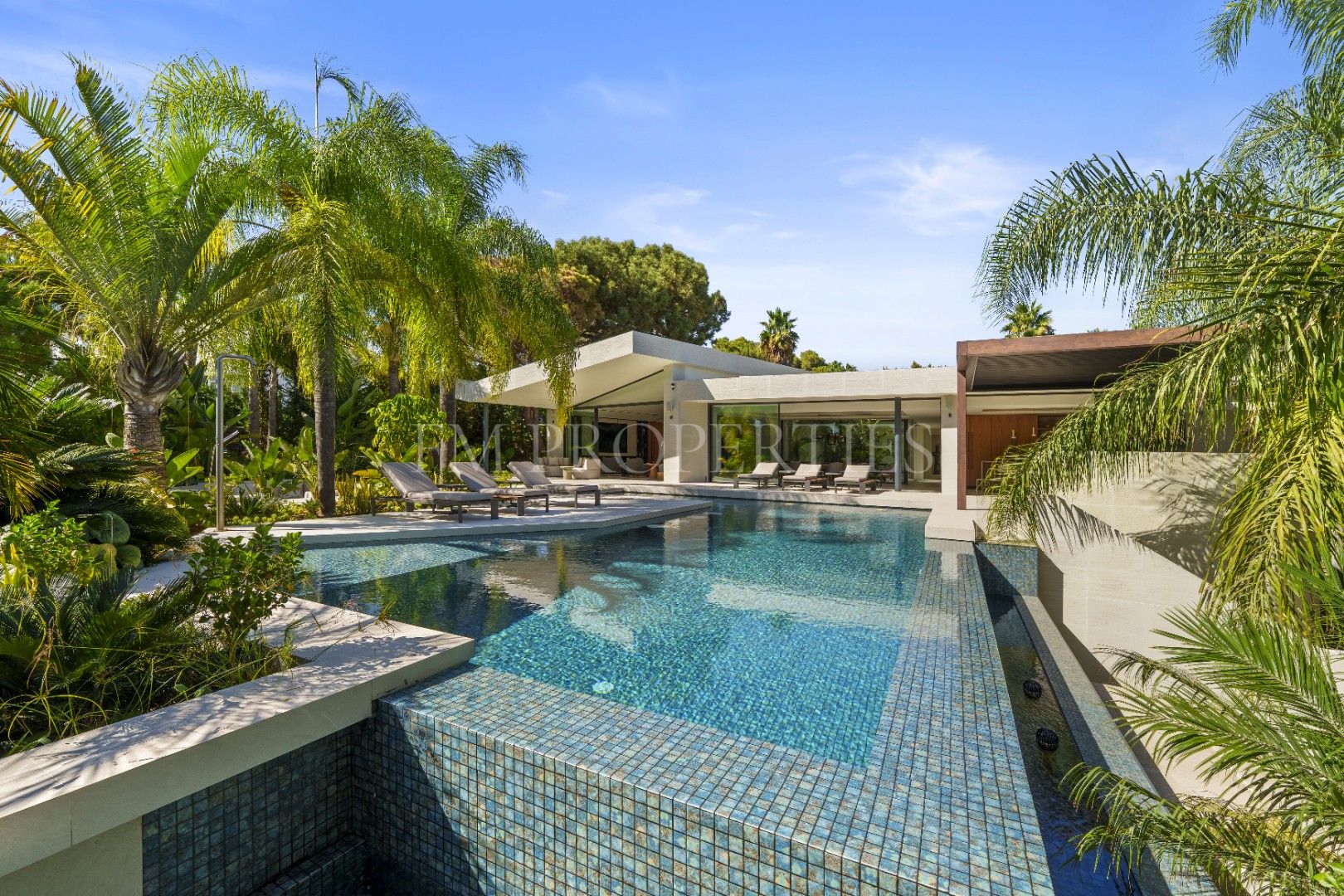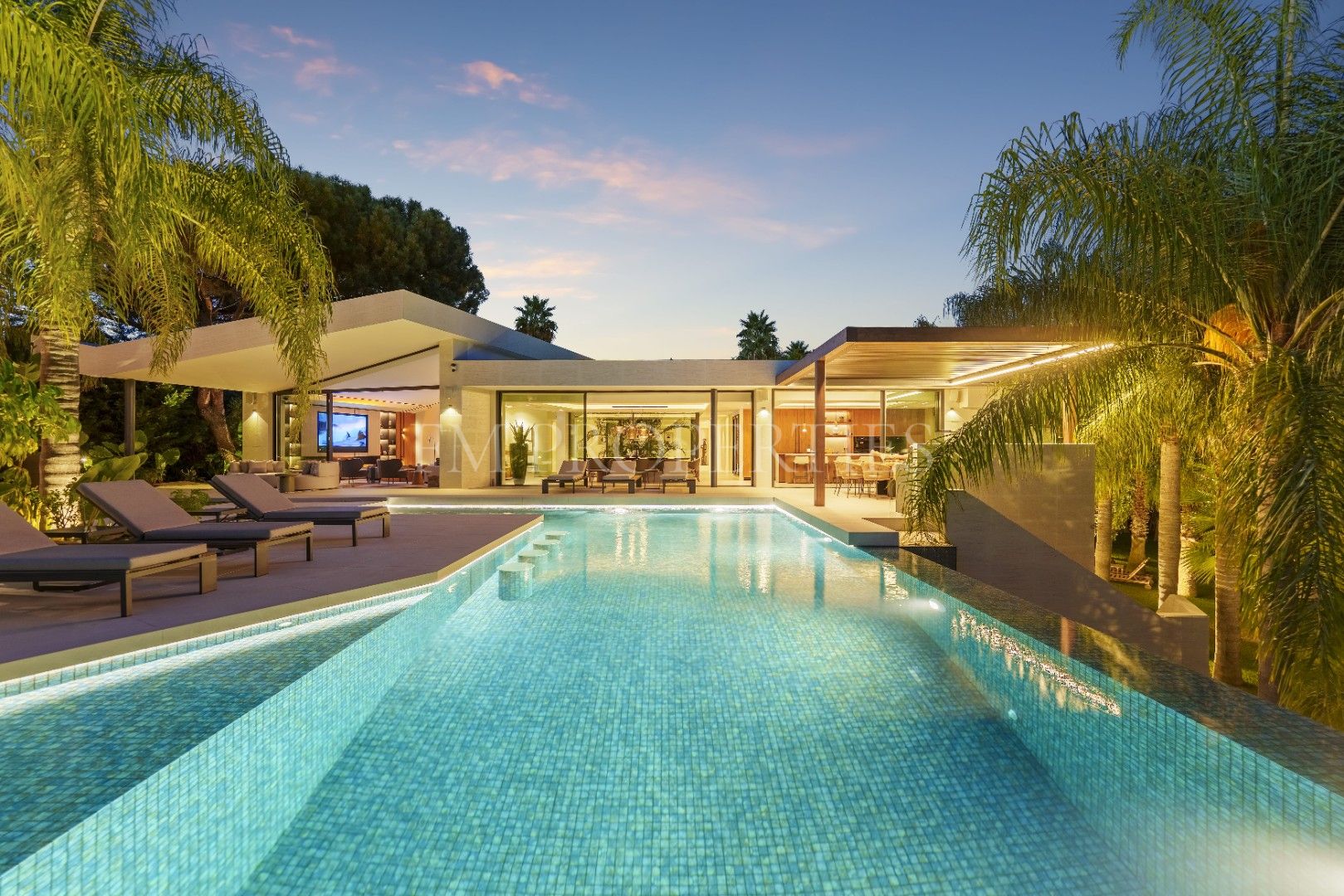 El exterior de Las Chapas 5 destaca por sus jardines maduros con palmeras, ofreciendo varias áreas de descanso y una piscina central rodeada de piedras y tumbonas. Además, cuenta con una terraza cubierta de comedor y un salón al aire libre con una chimenea hundida, creando ambientes acogedores tanto para el día como para la noche. El diseño de la villa asegura privacidad y, al mismo tiempo, maximiza la disfrute del clima de Marbella.