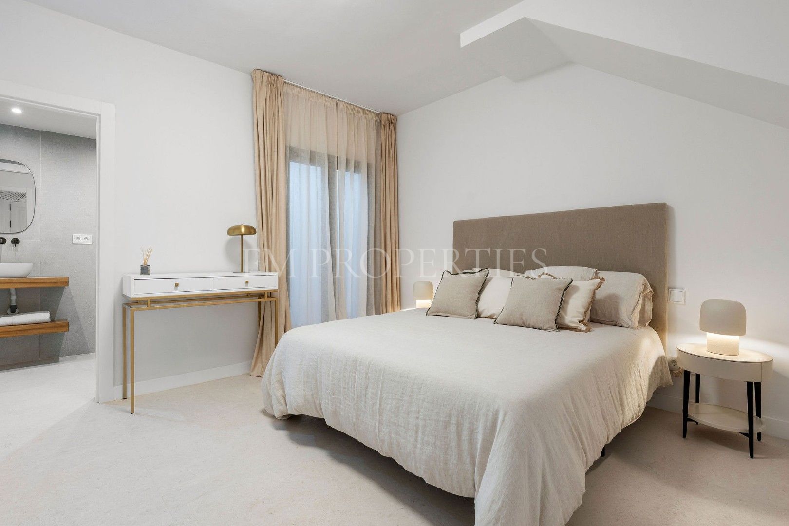 Desde la planta principal se accede a una terraza cubierta y a un jardín privado que conecta directamente con la primera línea del campo de golf Aloha. En la planta baja se encuentra un dormitorio en suite con acceso directo a un patio inglés, un espacio tranquilo ideal para el descanso personal. En la planta superior, el salón, el comedor y la cocina totalmente equipada con electrodomésticos Siemens se integran de forma armoniosa.