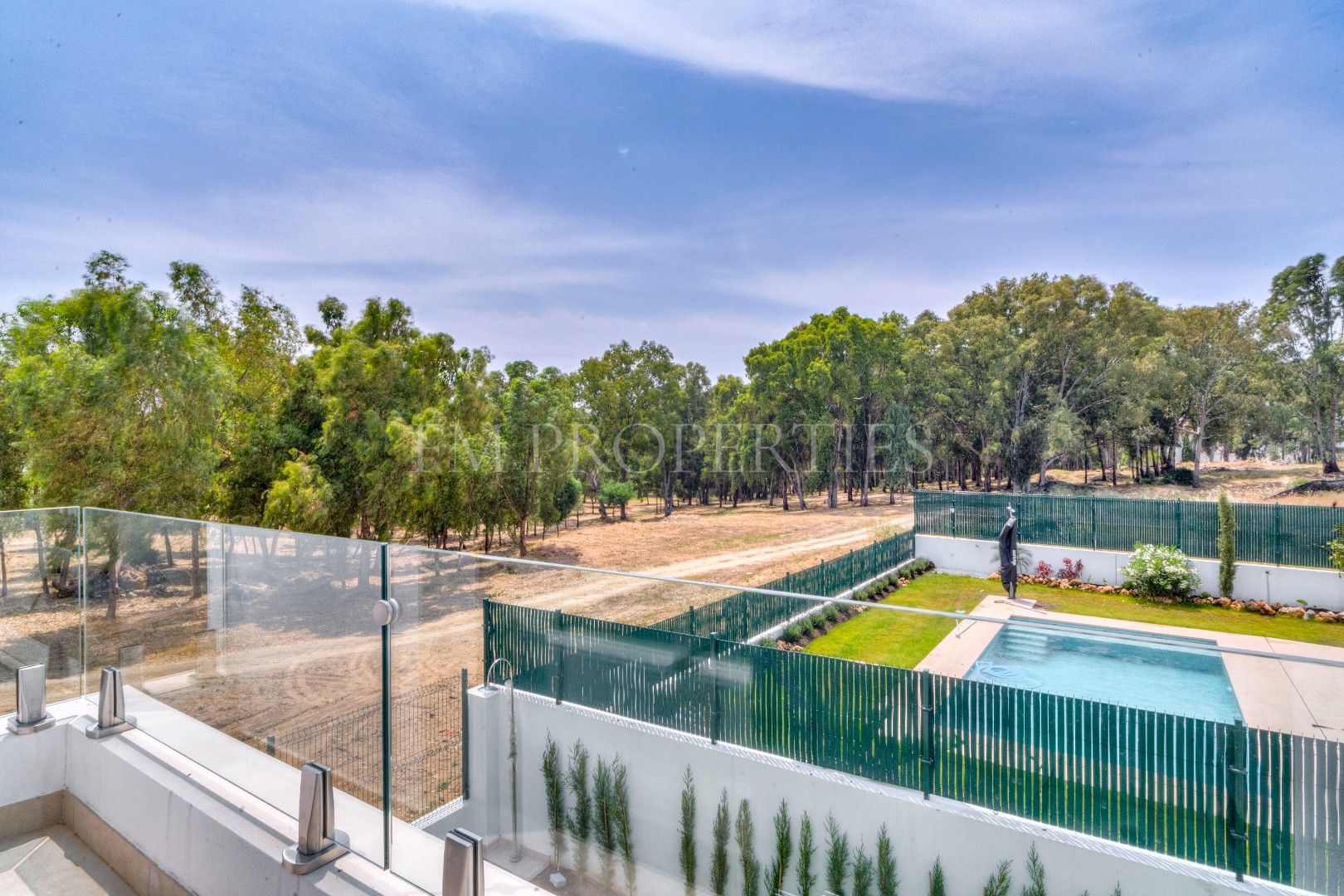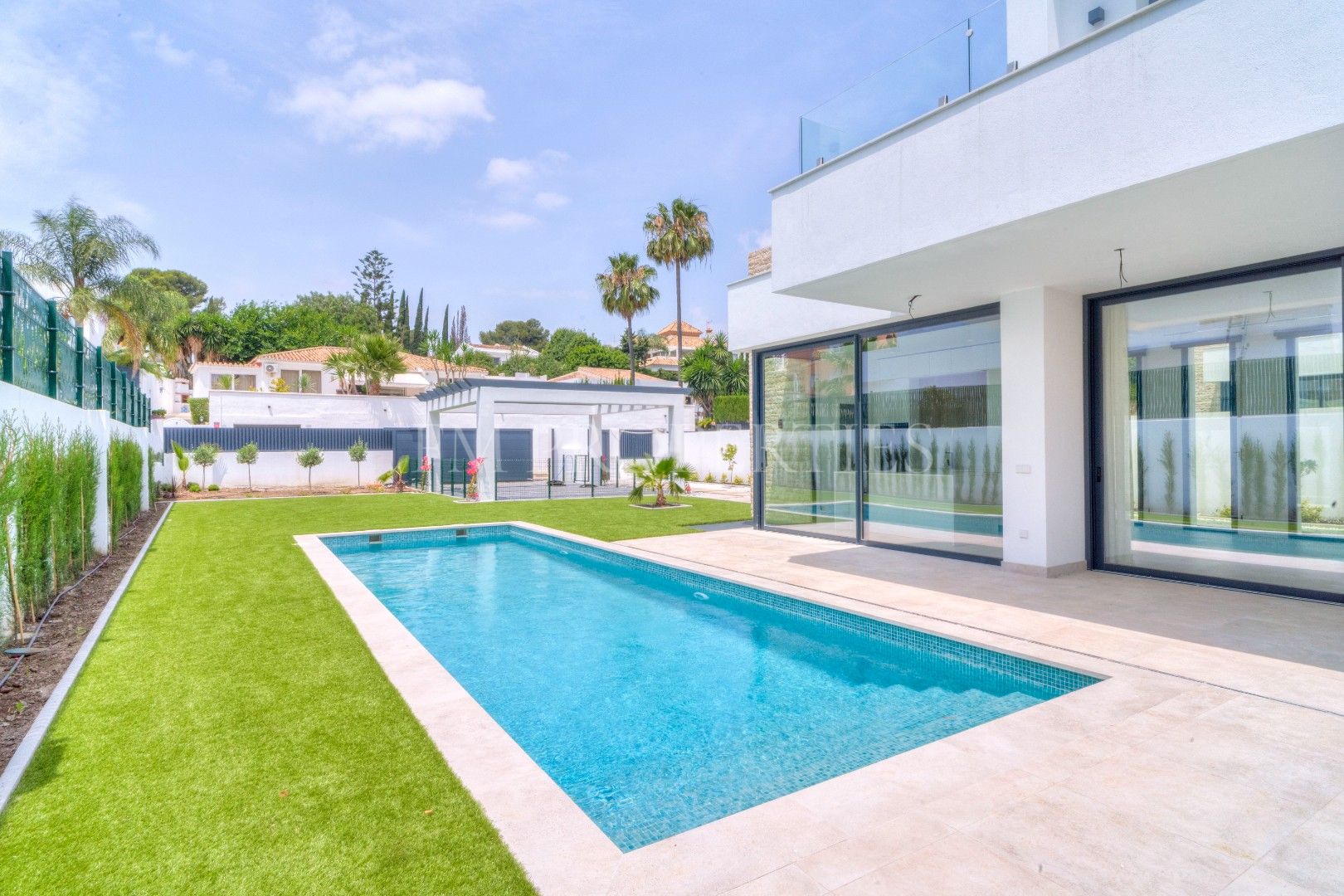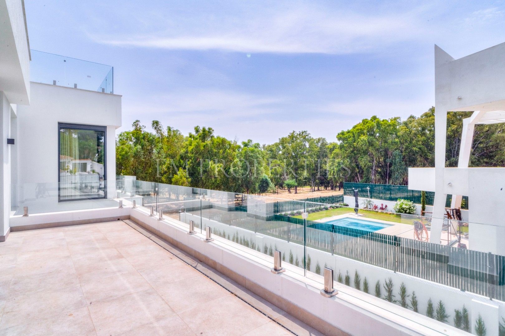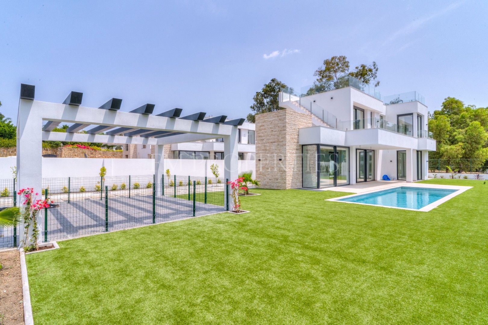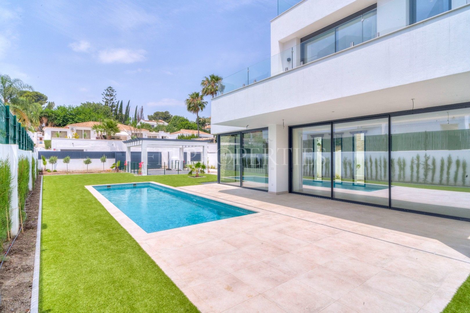 El exterior de Villa Flores está concebido como una extensión natural de la vivienda, con espacios ajardinados que se integran en el entorno protegido, además de una piscina privada ideal para disfrutar del clima soleado de la Costa del Sol durante todo el año. Un amplio garaje completa la funcionalidad de la propiedad.
