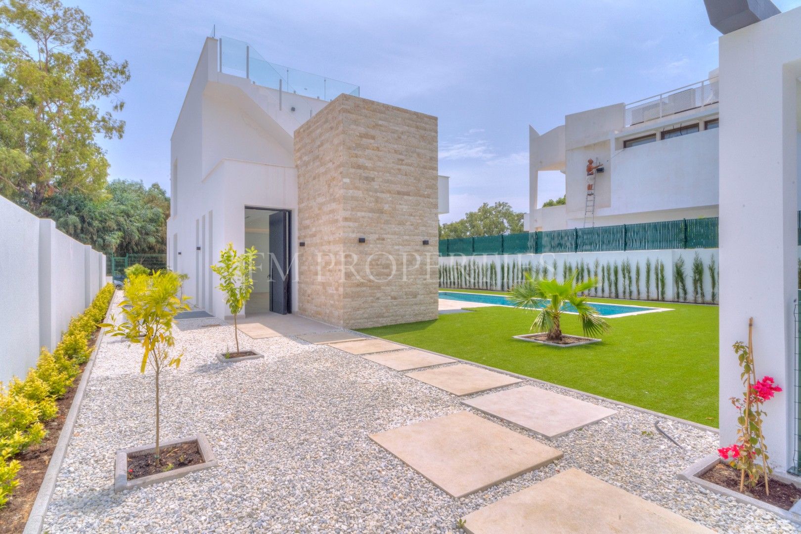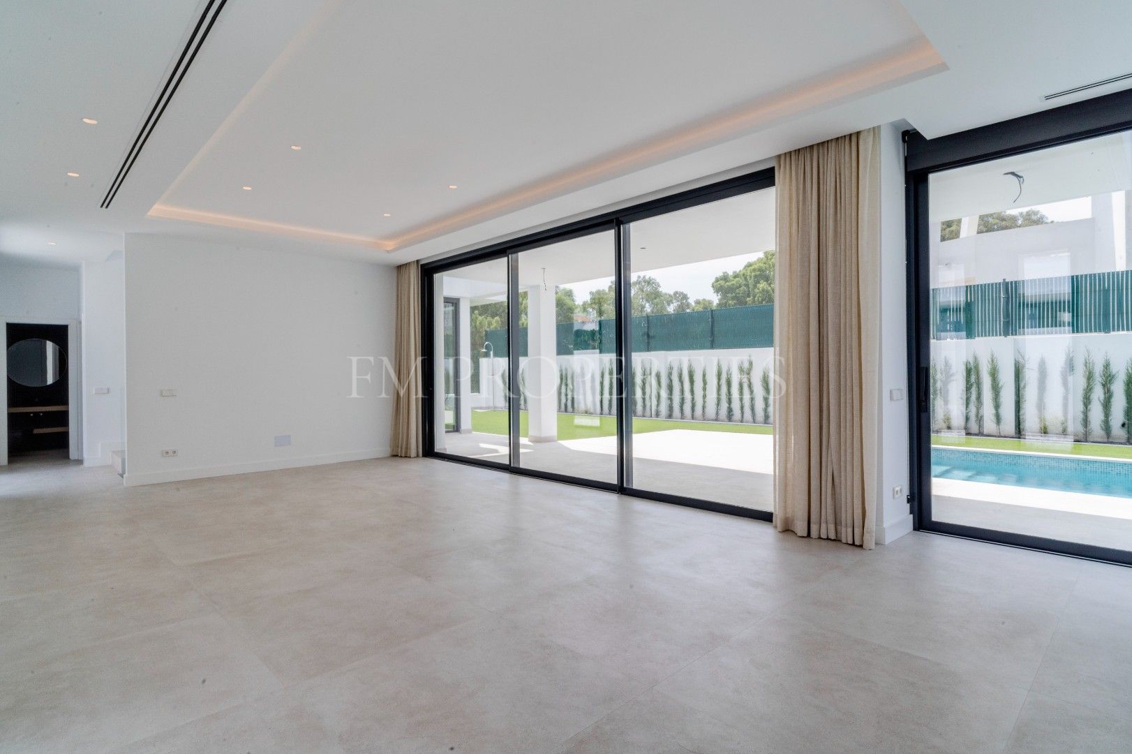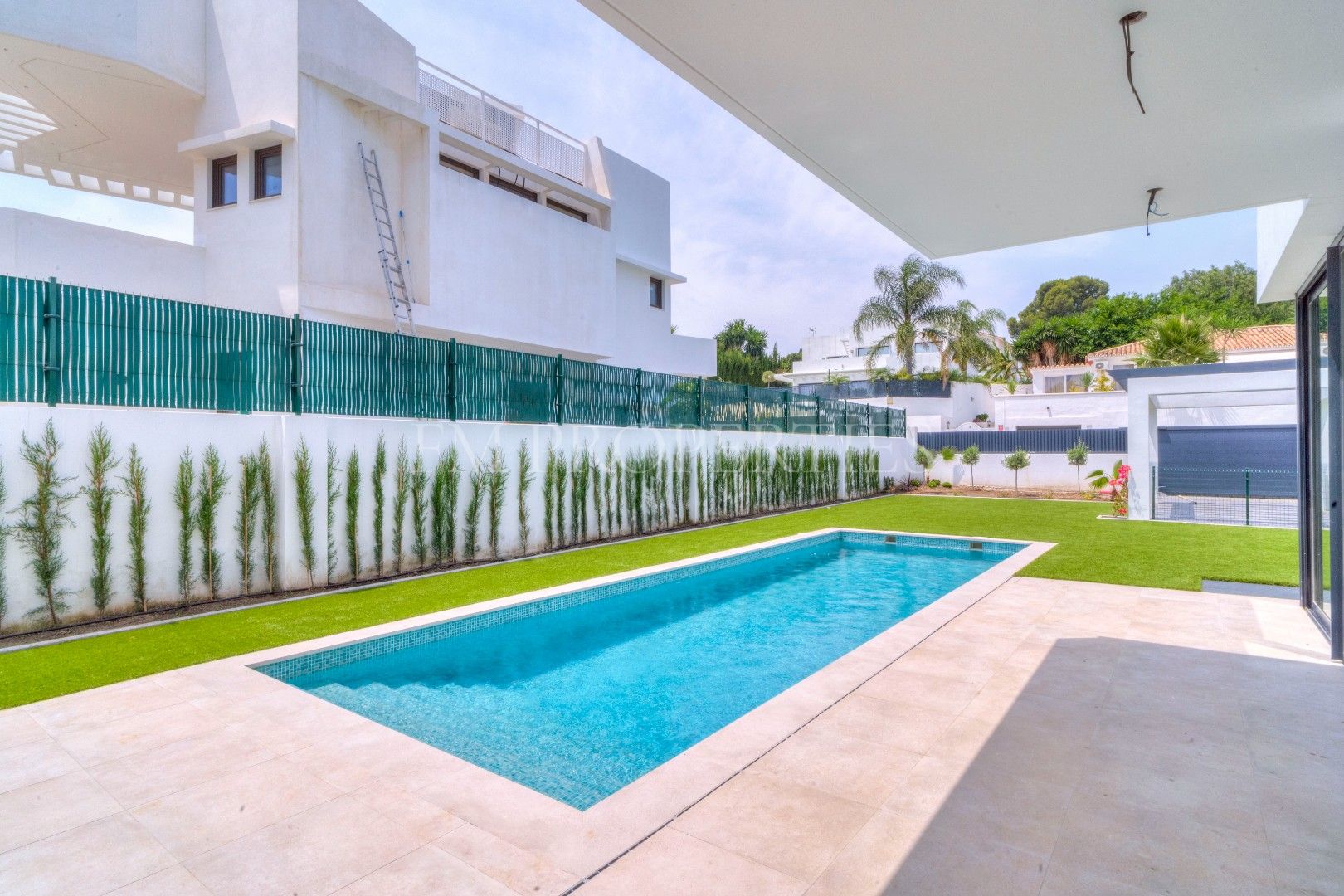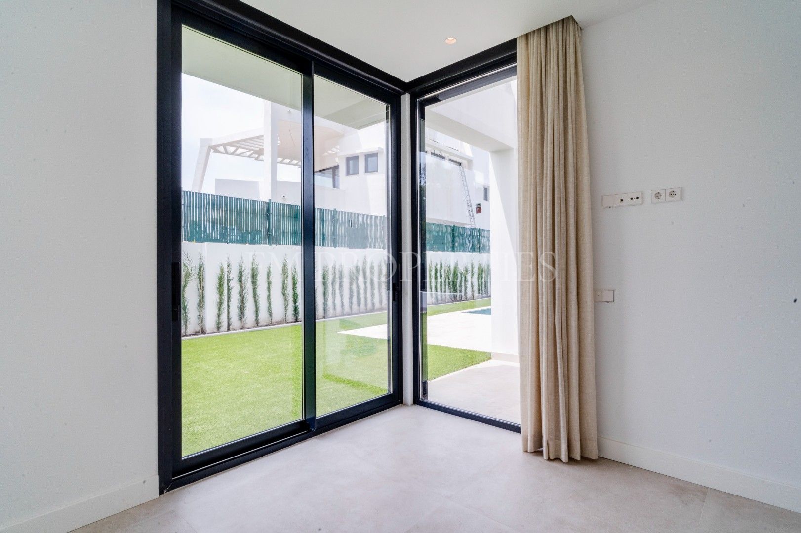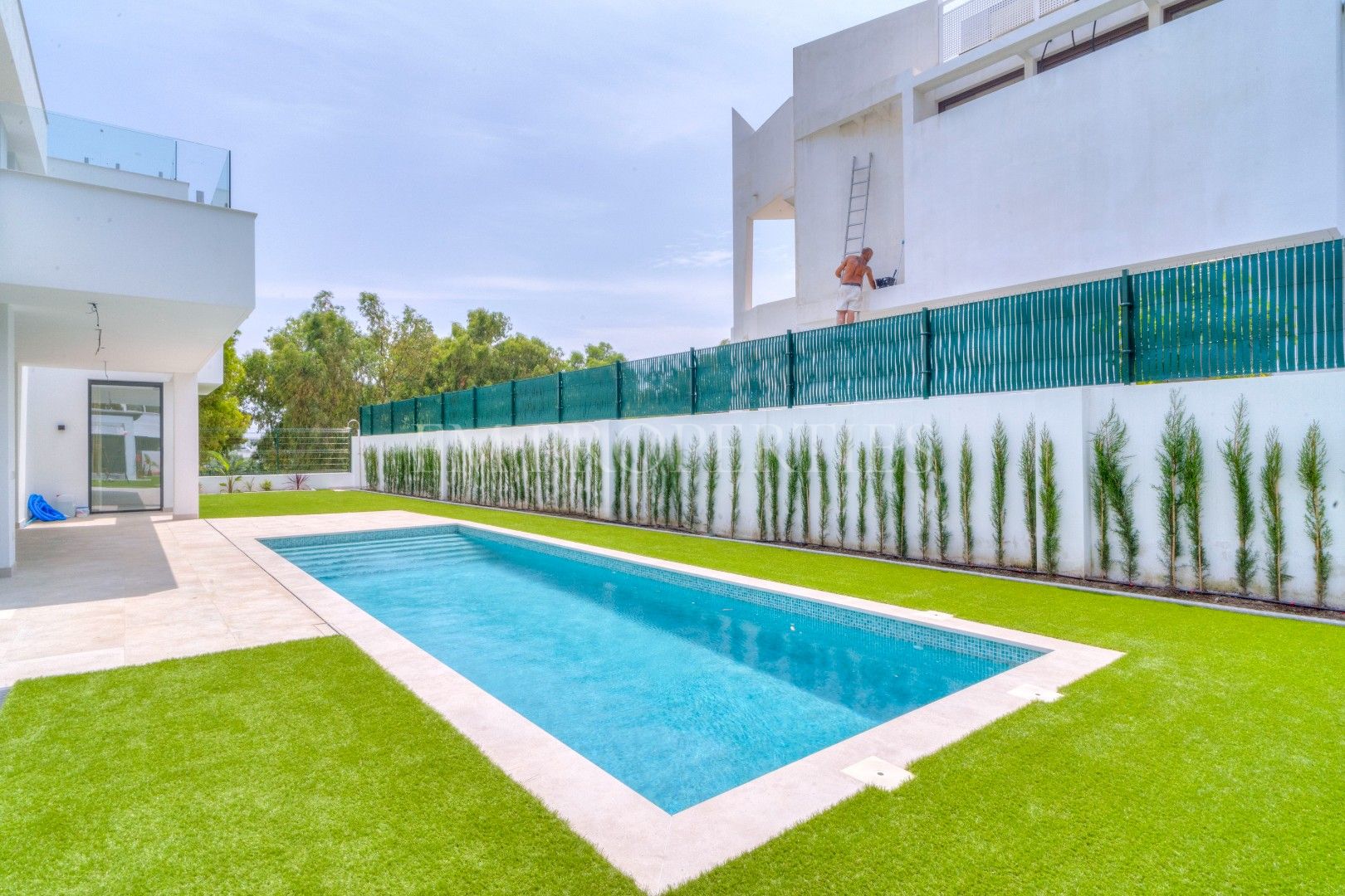 El exterior de Villa Flores está concebido como una extensión natural de la vivienda, con espacios ajardinados que se integran en el entorno protegido, además de una piscina privada ideal para disfrutar del clima soleado de la Costa del Sol durante todo el año. Un amplio garaje completa la funcionalidad de la propiedad.