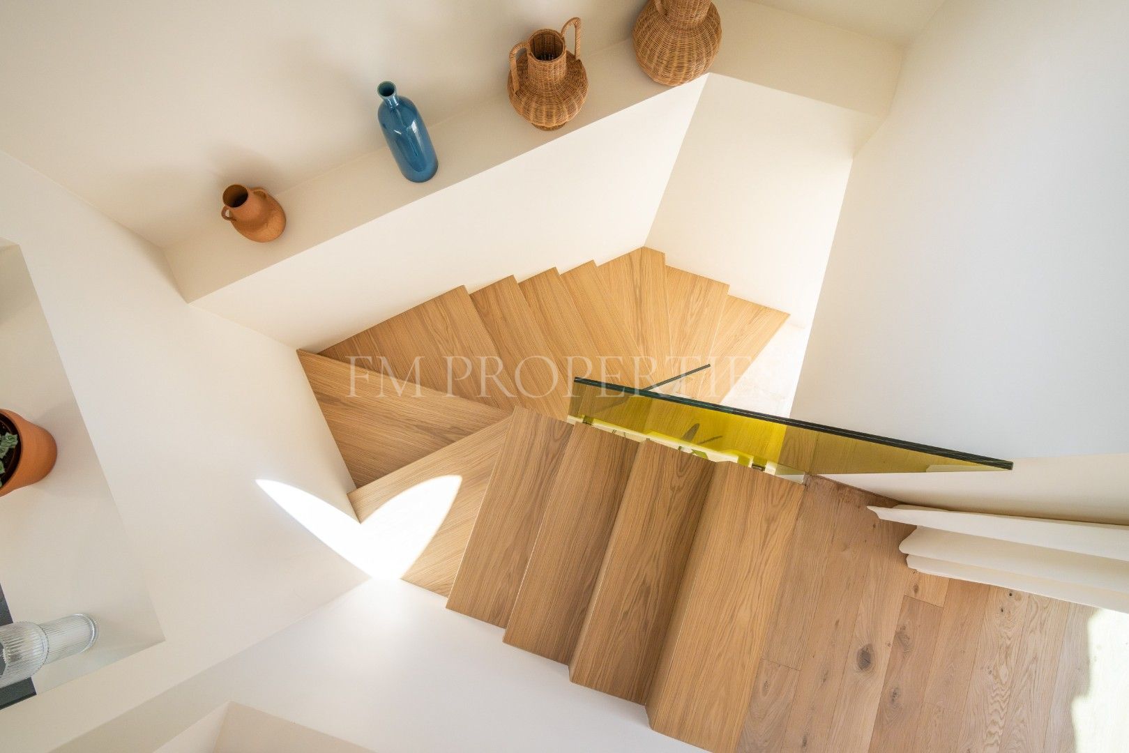 Cada detalle ha sido seleccionado con precisión: travertino natural en tonos rojo y crema, carpinterías en madera ámbar, parquet ecológico multicapa y un sistema de puertas arquitectónicas que desaparecen para conectar el interior con las terrazas ajardinadas. La iluminación, firmada por casas europeas de referencia como Delta Light, Arkoslight y Artemide, envuelve cada estancia en una atmósfera sofisticada. El mobiliario, elegido entre firmas como Saba Italia, Ditre Italia, Zanotta, &Tradition, Hay o Ferm Living, aporta carácter, diseño y confort a cada rincón.