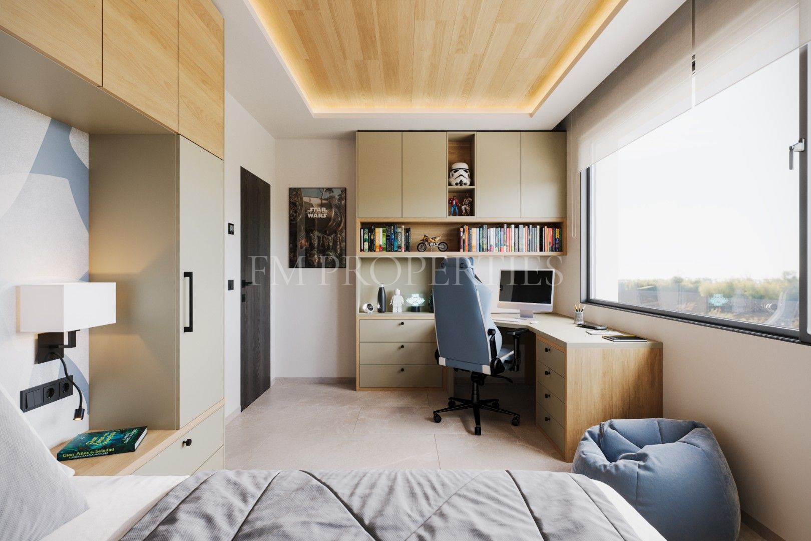 En la planta superior, la suite principal cuenta con terraza privada, vestidor y un baño de estilo spa con bañera y ducha, mientras que tres dormitorios adicionales en suite aseguran confort y privacidad tanto para la familia como para los invitados. La tecnología domótica de vanguardia de Zennio mejora cada aspecto de la propiedad, incluyendo iluminación automática, estores opacos, acceso por huella dactilar y sistemas de climatización de control individual.