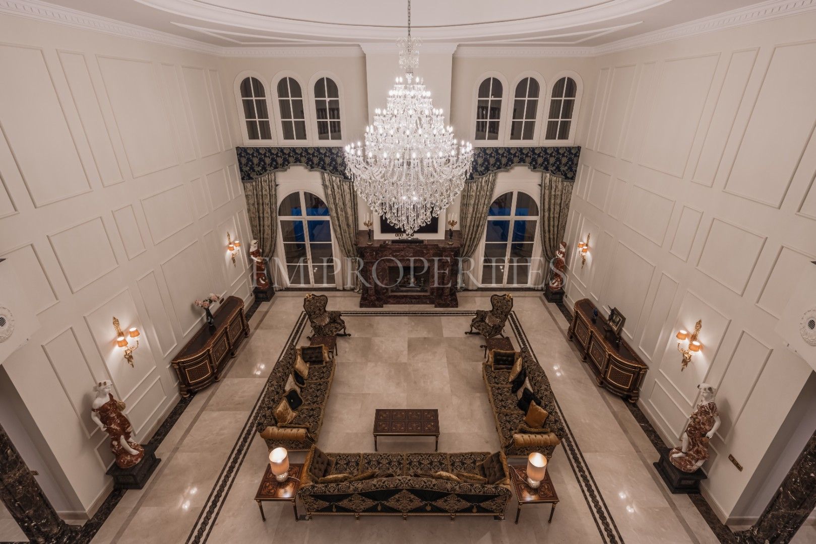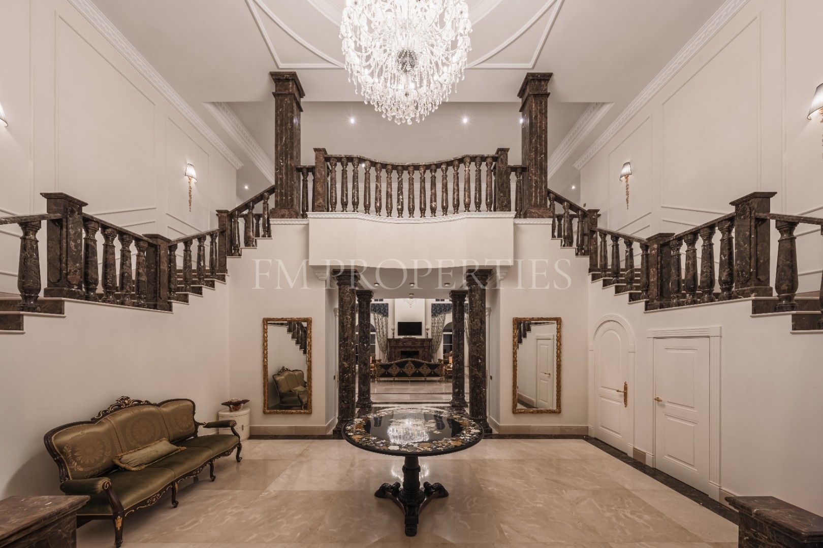 Villa Sinfonía est un domaine exceptionnel de trois étages à vendre dans la prestigieuse communauté fermée de Sierra Blanca sur la Costa del Sol. Construite il y a seulement dix ans, cette résidence sophistiquée marie harmonieusement l’architecture néoclassique et le luxe moderne. Dès l’entrée, un imposant hall avec un plafond de 9 mètres de haut et l’éclat des lustres électriques reflètent l’élégance et le souci du détail qui caractérisent toute la maison.