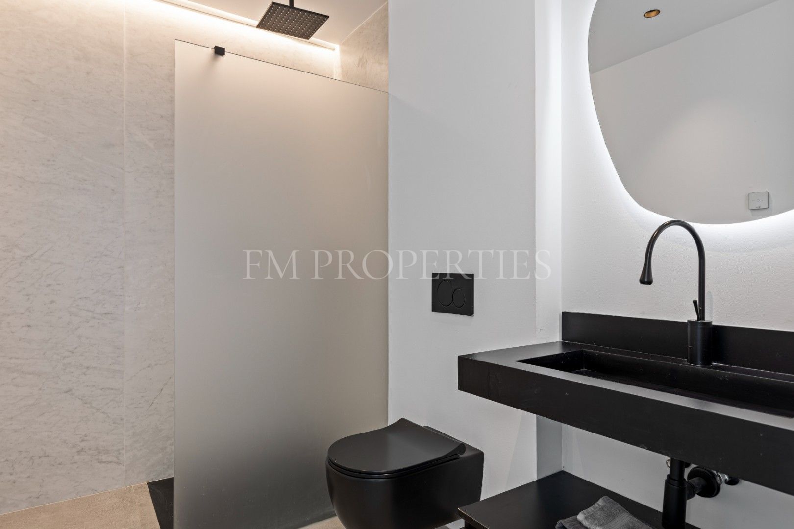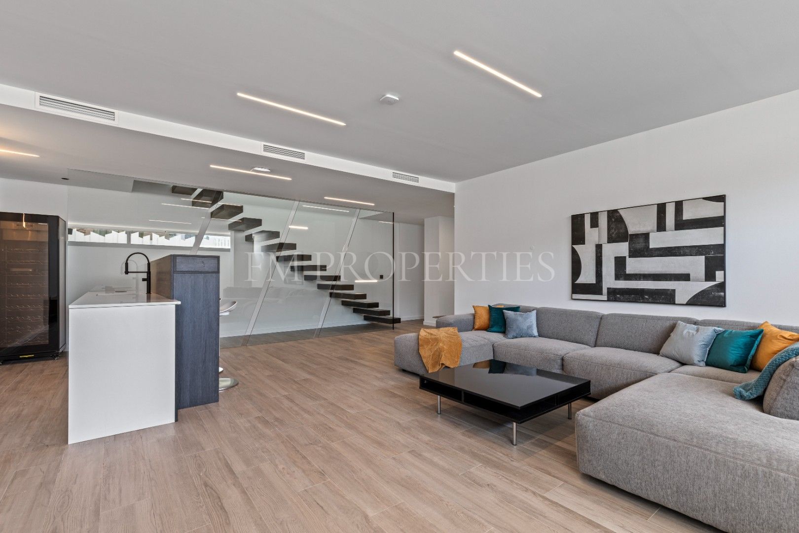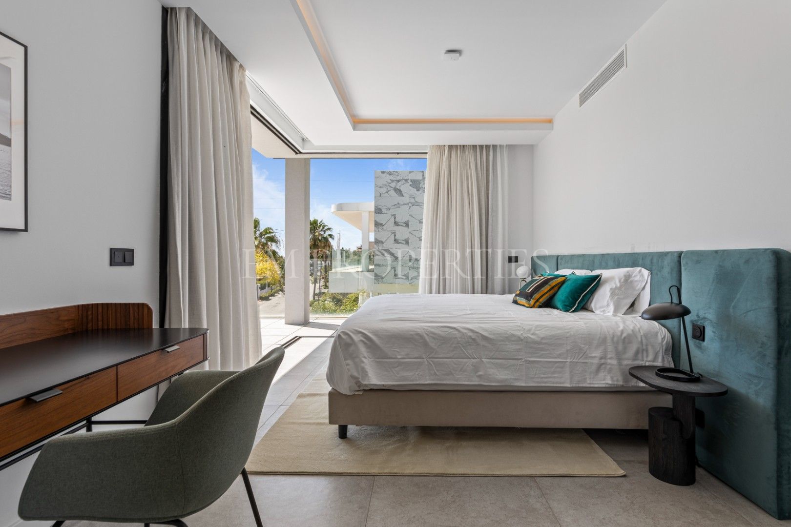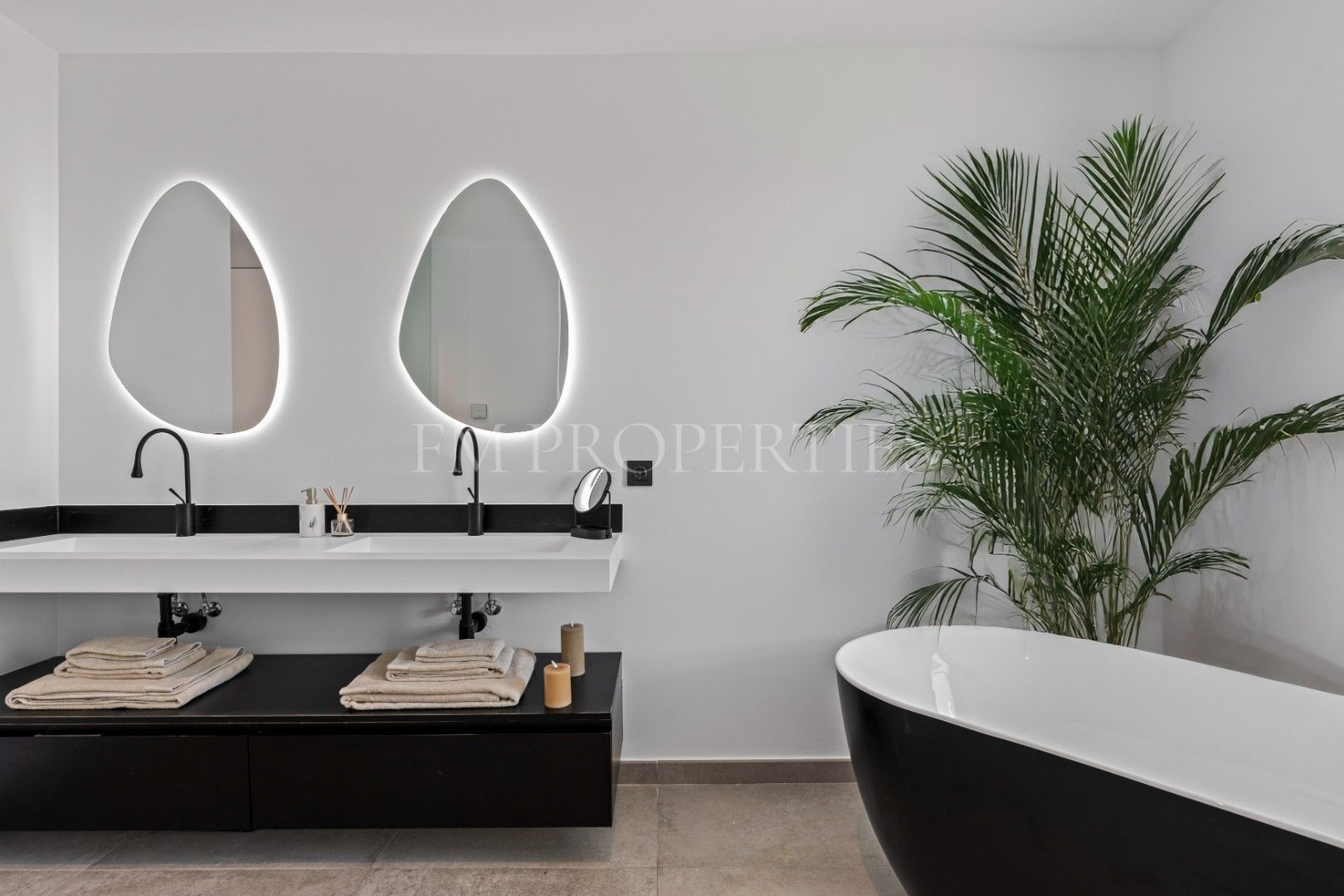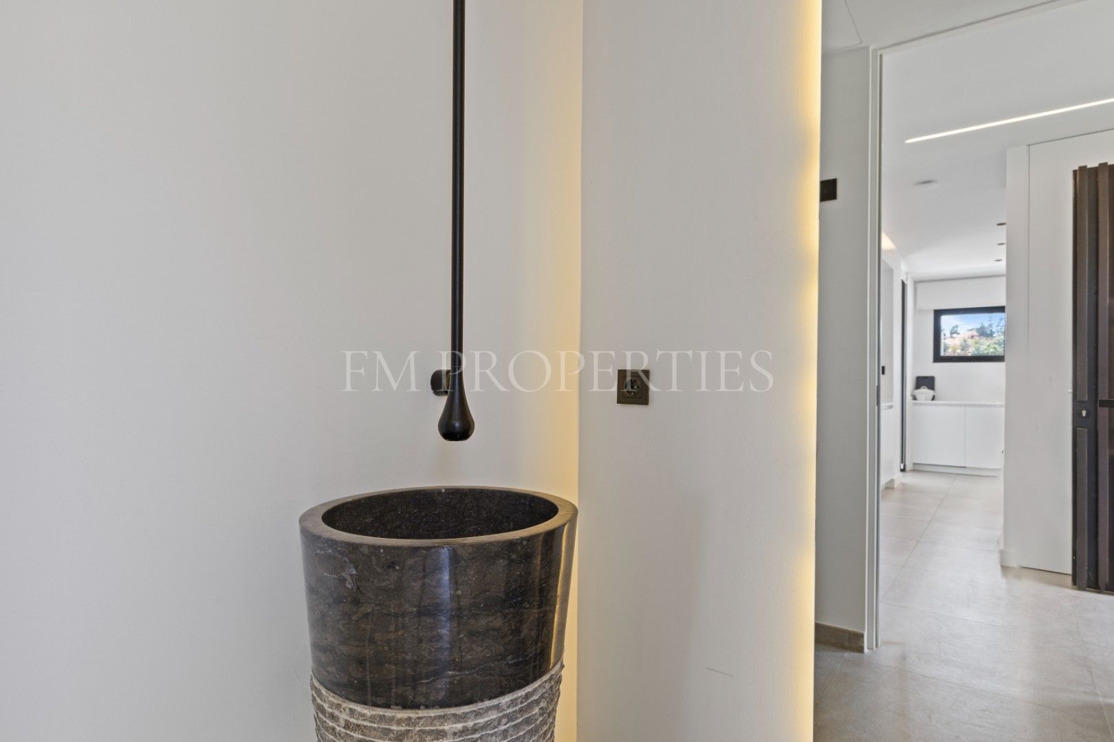 Bij binnenkomst via een grote houten pivoterende deur wordt u verwelkomd in lichte, open leefruimtes, omlijst door schuifpuien van vloer tot plafond die in de muren verdwijnen, wat zorgt voor een naadloze overgang tussen binnen en buiten. De begane grond omvat een ruime woonkamer, een hypermoderne keuken en een gastentoilet. Buiten bevindt zich een prachtig aangelegde tuin met infinitypool en automatisch irrigatiesysteem, ideaal om te ontspannen.