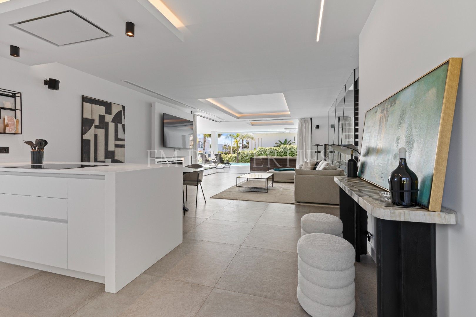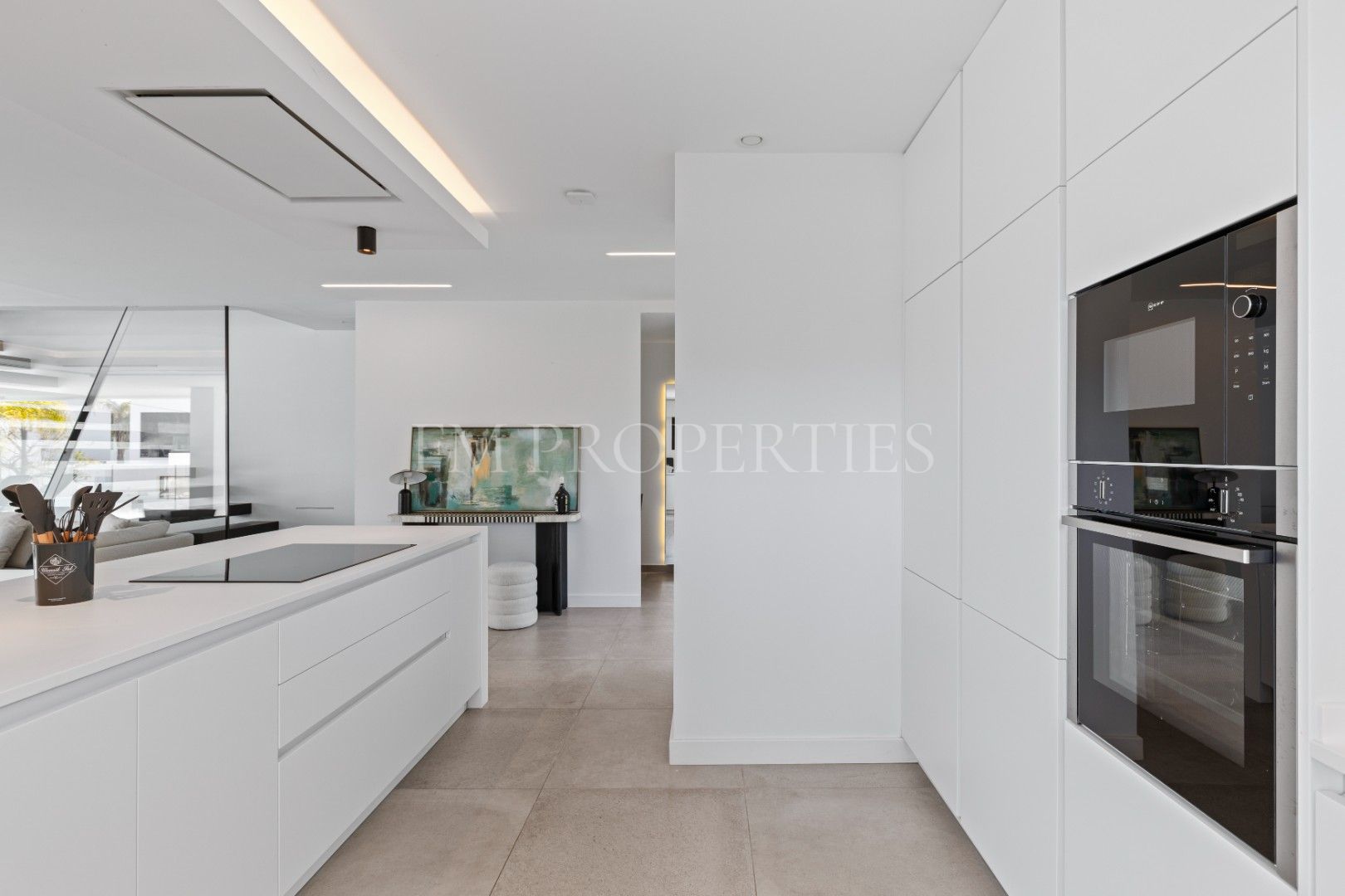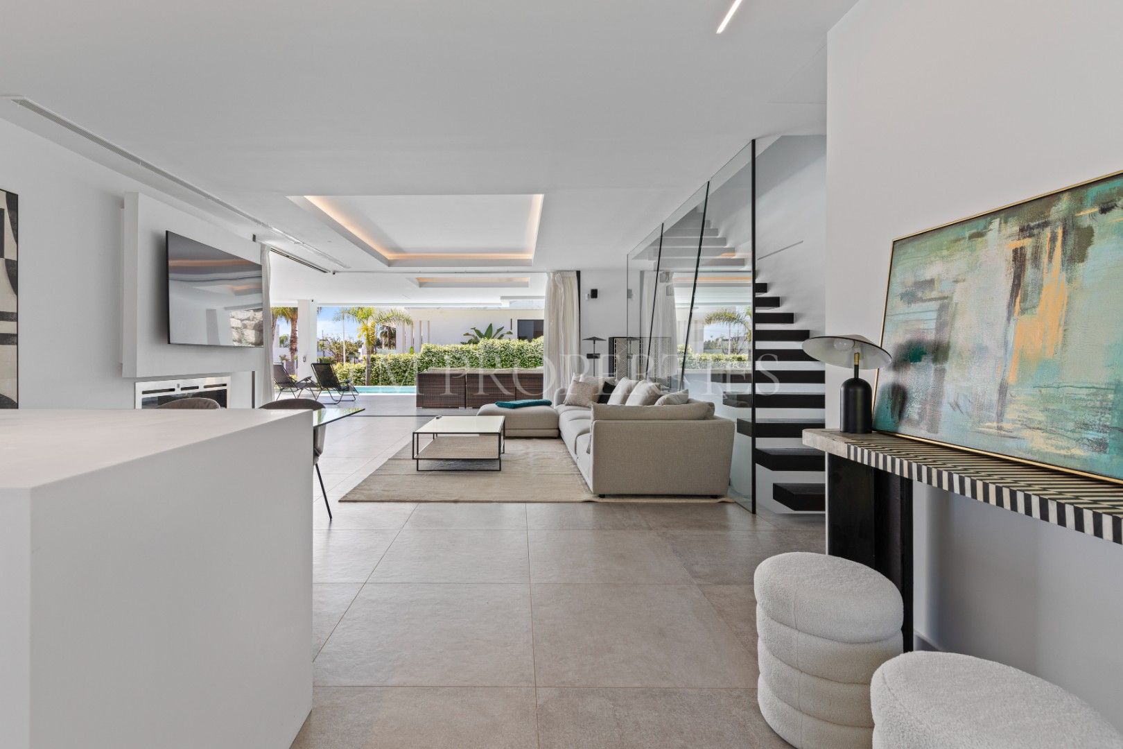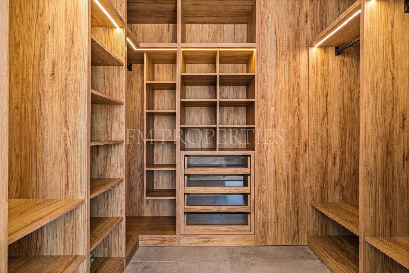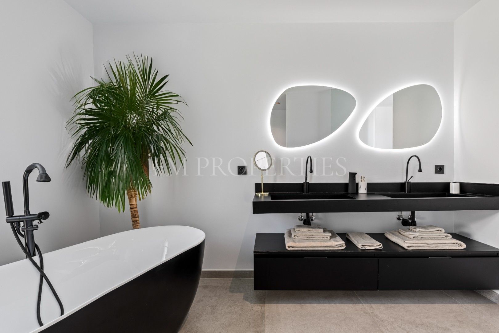 Bij binnenkomst via een grote houten pivoterende deur wordt u verwelkomd in lichte, open leefruimtes, omlijst door schuifpuien van vloer tot plafond die in de muren verdwijnen, wat zorgt voor een naadloze overgang tussen binnen en buiten. De begane grond omvat een ruime woonkamer, een hypermoderne keuken en een gastentoilet. Buiten bevindt zich een prachtig aangelegde tuin met infinitypool en automatisch irrigatiesysteem, ideaal om te ontspannen.