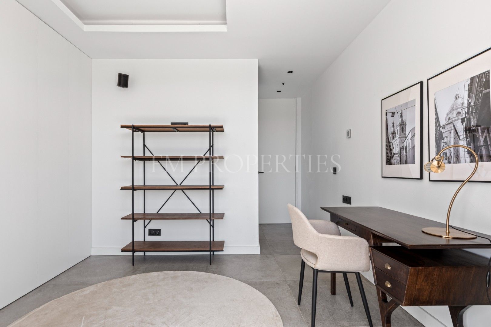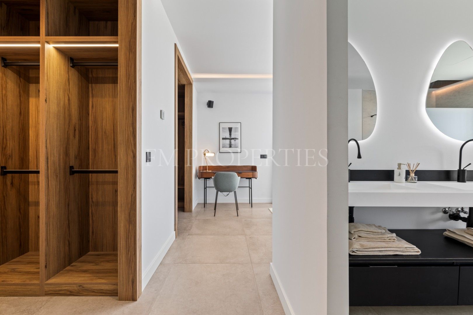 De eerste verdieping beschikt over drie slaapkamers met en-suite badkamers, waaronder een ruime master suite met twee inloopkasten. Alle kamers hebben toegang tot terrassen via hoogwaardige glazen schuifdeuren die in de muren verdwijnen voor maximale openheid. De gehele verdieping is voorzien van vloerverwarming voor optimaal comfort het hele jaar door.
