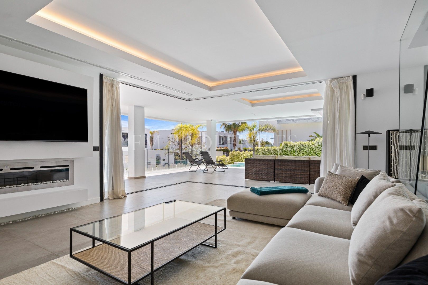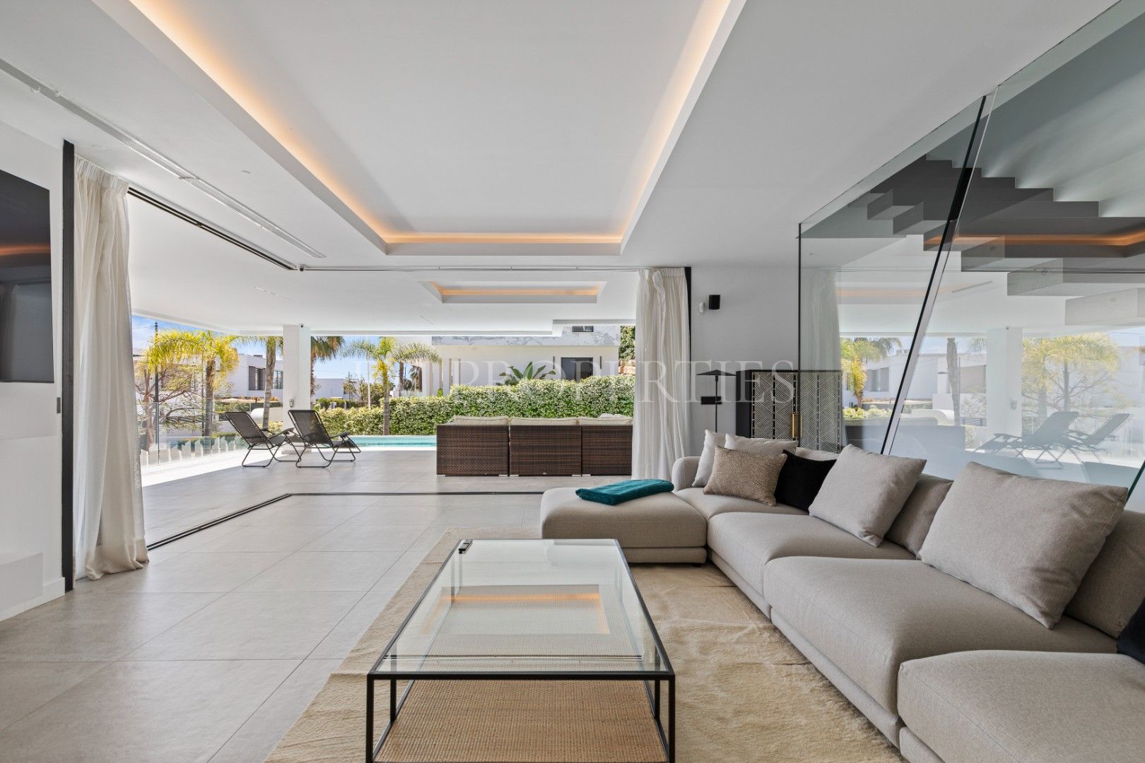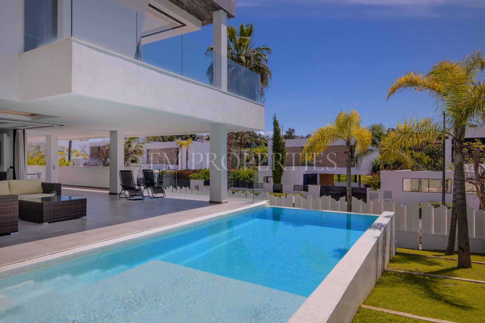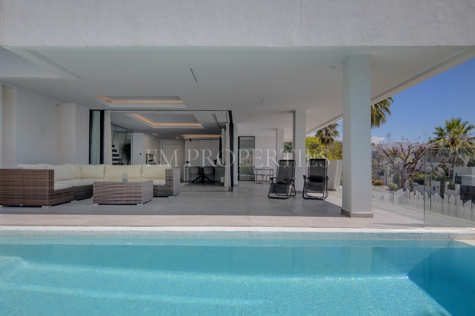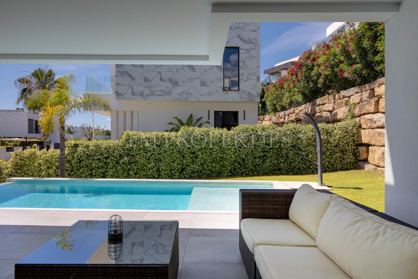 Deze uitzonderlijke nieuwbouwvilla, voltooid in 2022, bevindt zich in de gewilde wijk El Campanario in Estepona, op loopafstand van de prestigieuze El Campanario Golf & Country Club. Ze biedt een rustige omgeving op slechts enkele minuten van het strand, San Pedro de Alcántara en Puerto Banús, en vormt zo de perfecte balans tussen rustig wonen en gemakkelijke toegang tot lokale voorzieningen. Ontworpen met moderne elegantie en minimalisme, is de villa verdeeld over vier niveaus — kelder (112 m²), begane grond (150 m²), eerste verdieping (143 m²) en een ruim dakterras (132 m²) — waardoor het een royale woning is met een uitstekende prijs-kwaliteitverhouding op een toplocatie.