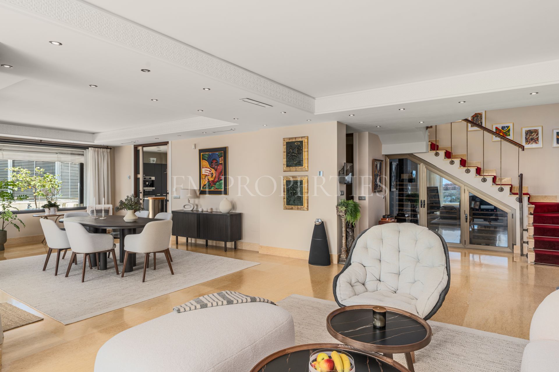 Dit ruime duplex penthouse bevindt zich in het prestigieuze wooncomplex Los Arrayanes, in de rustige en verhoogde wijk Supermanzana JKL van Nueva Andalucía. Verdeeld over twee zorgvuldig ontworpen verdiepingen beschikt de woning over drie ruime slaapkamers, een kantoor en drie moderne badkamers. De totale bebouwde oppervlakte bedraagt circa 363 vierkante meter, aangevuld met royale terrassen van 439 vierkante meter voor optimaal buitenleven. Gebouwd in 2007 combineert deze woning hedendaags comfort met duurzame architectonische kwaliteit.