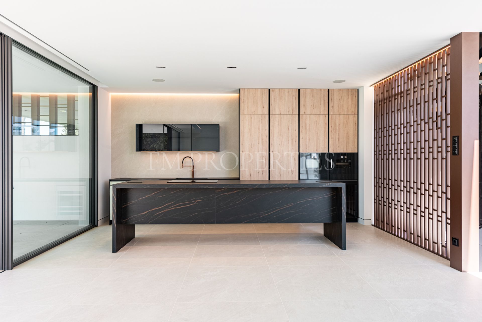 Het ontwerp van de villa maximaliseert het natuurlijke licht dankzij de vloer-tot-plafondramen en biedt adembenemende uitzichten vanaf elk niveau — in het bijzonder vanaf het dakterras met uitzicht over de Middellandse Zee. De open leefruimtes combineren elegantie met comfort, terwijl de ultramoderne keuken is uitgerust met Gaggenau-apparatuur, marmeren werkbladen en maatwerk meubilair.