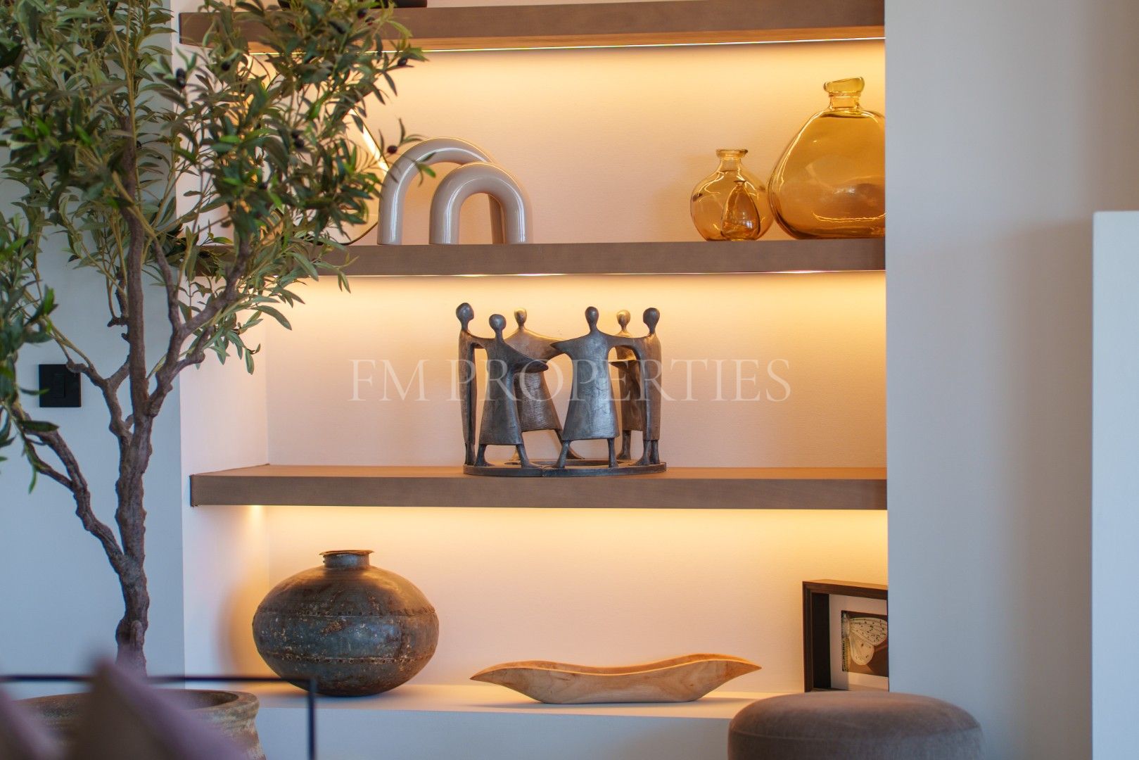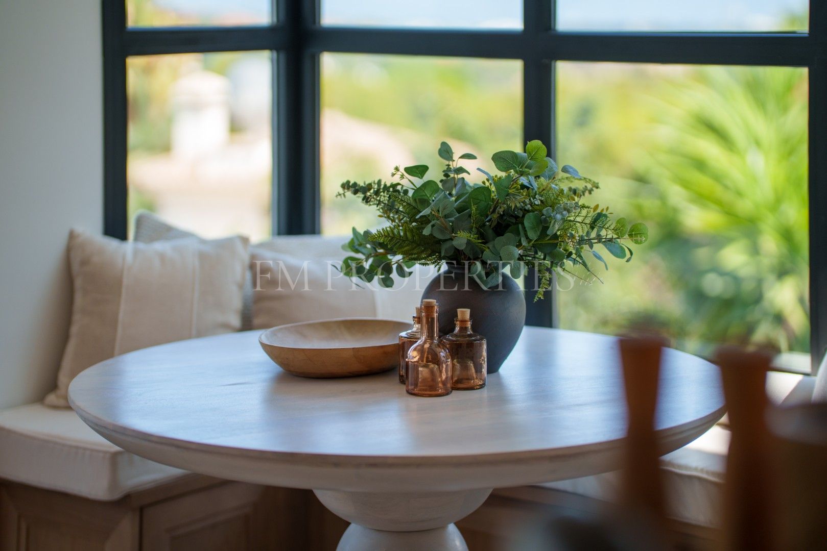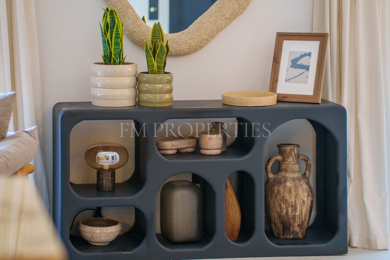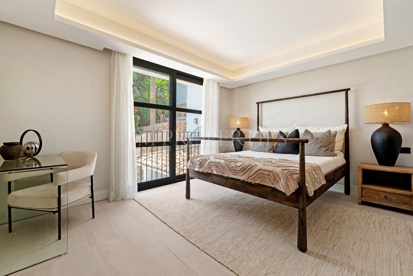 Elke kamer straalt een perfecte balans uit tussen comfort en verfijning. Neutrale tinten, natuurlijke texturen en ambachtelijke afwerkingen creëren een warme en elegante sfeer. Maatwerkmeubilair, sculpturale verlichting en zorgvuldig gekozen decoratieve details geven karakter en klasse, terwijl het natuurlijke licht de mediterrane omgeving benadrukt.