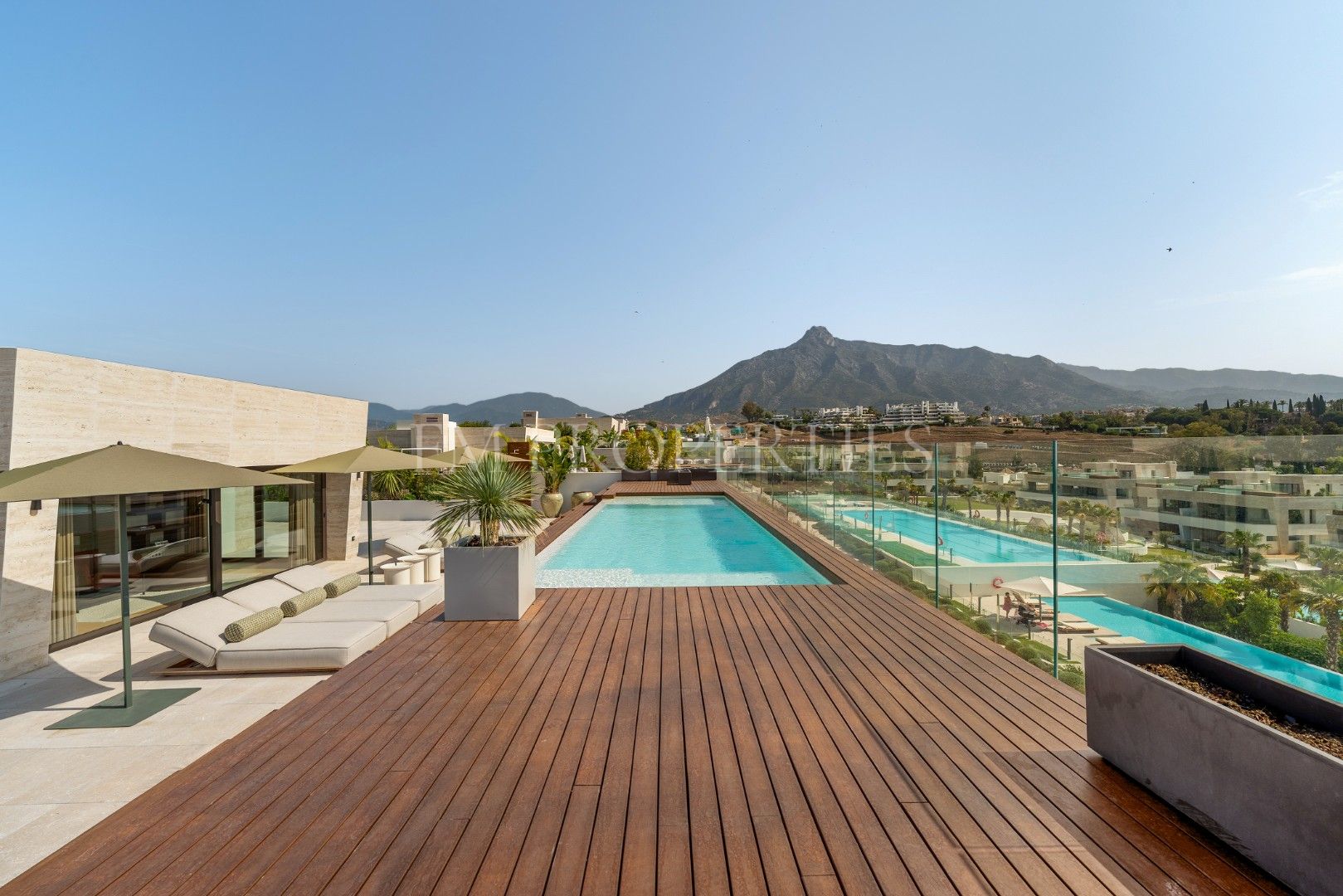 Op de bovenverdieping biedt een privézwembad een persoonlijke oase, aangevuld met de mogelijkheid om een bar of barbecue te installeren voor ultiem plezier en entertainment.